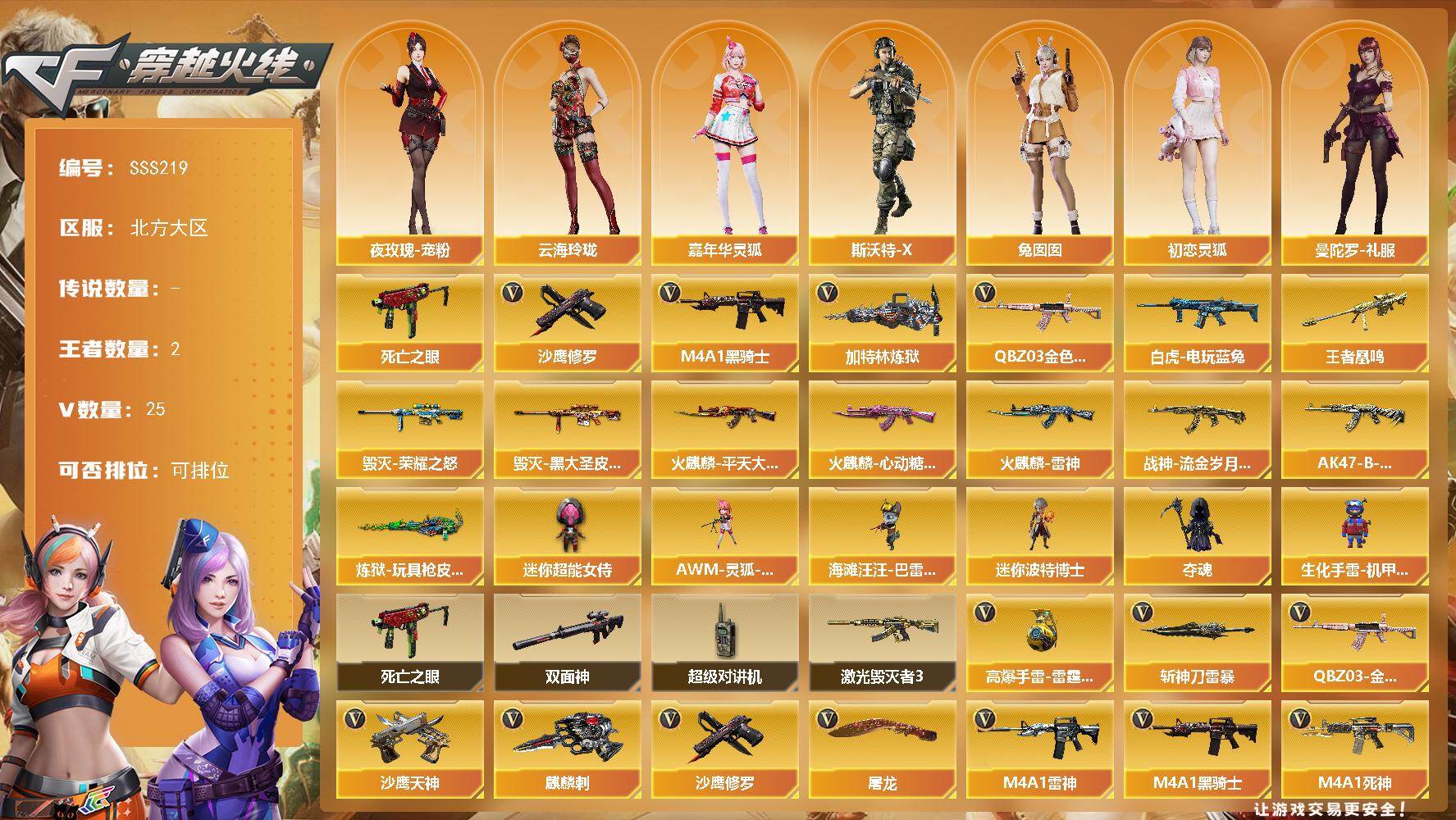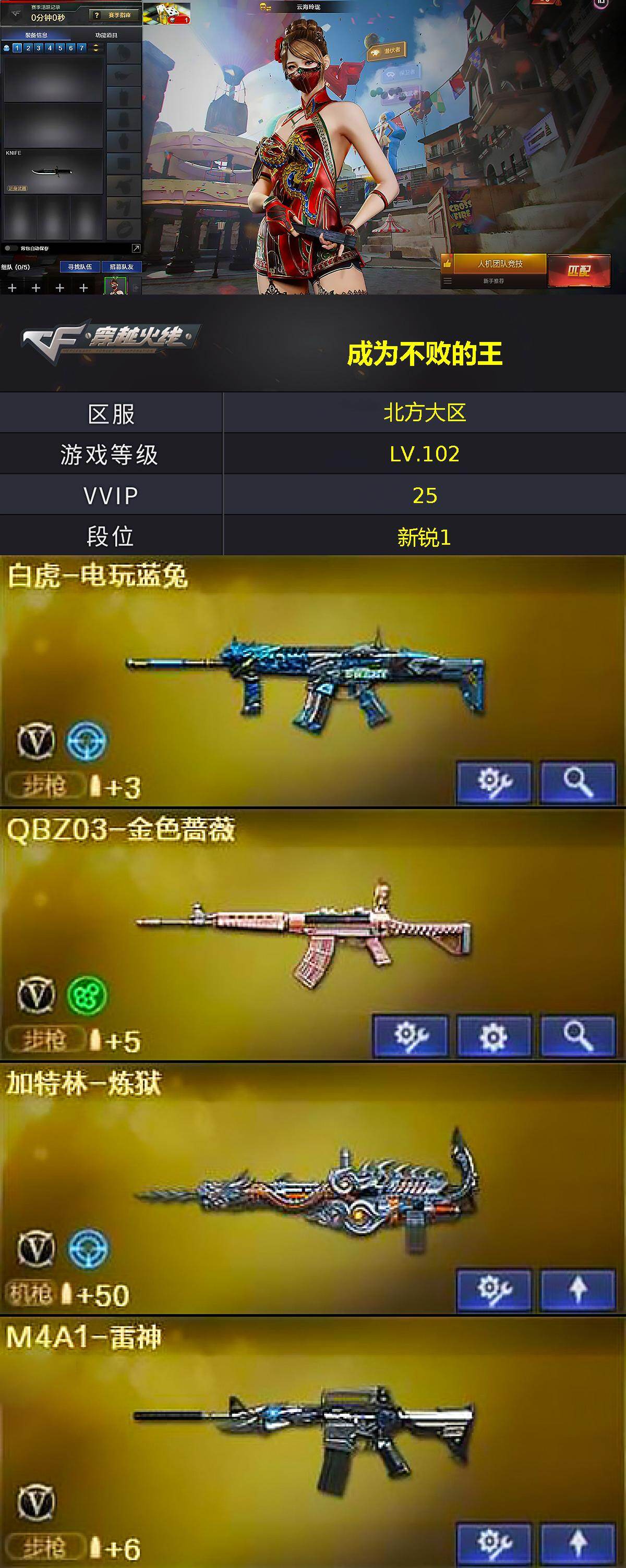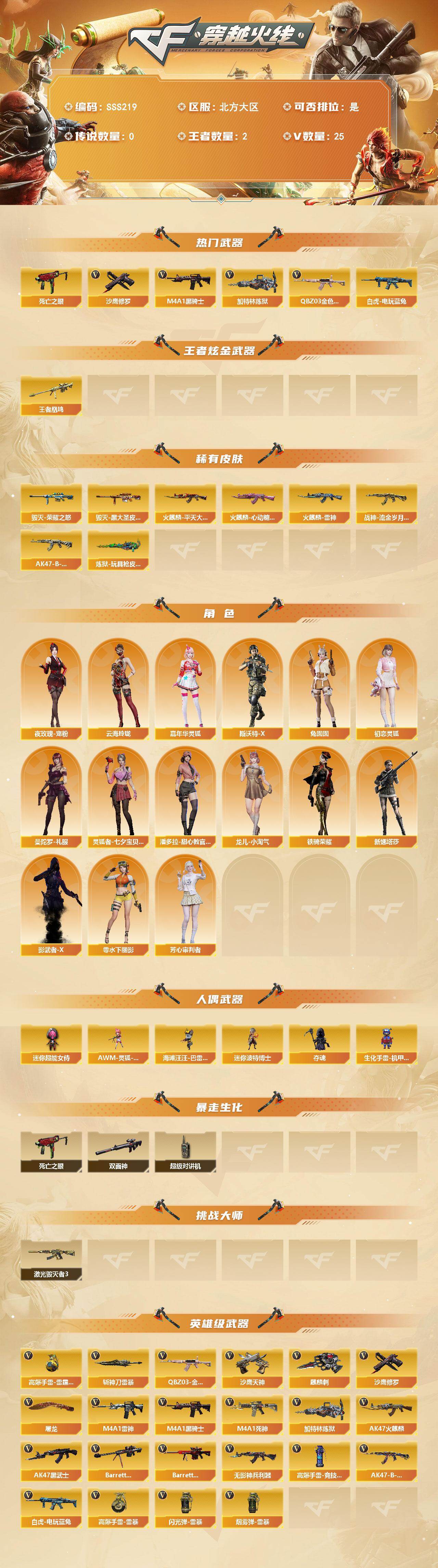 [17642207]北方大区-25V-2王者武器数-0炫金武器数 【热门武器】:QBZ03-金色蔷薇,死亡之眼,白虎-电玩蓝兔,M4A1-黑骑士,加特林-炼狱,沙鹰-修罗 【王者炫金武器】:王者凰鸣 【皮肤】:火麒麟-雷神,火麒麟-平天大圣,火麒麟-心动糖果,毁灭-荣耀之怒,毁灭-黑大圣皮肤,战神-流金岁月皮肤,AK47-B-常胜将军-刘备,炼狱-玩具枪皮肤 【角色】:云海玲珑,初恋灵狐,芳心审判者,嘉年华灵狐,零-水下丽影,灵狐者-七夕宝贝,龙儿-小淘气,曼陀罗-礼服,潘多拉-甜心教官,斯沃特-X,铁骑荣耀,兔囡囡,新娜塔莎,夜玫瑰-宠粉,影武者-X 【人偶武器】:AWM-灵狐-15周年嘉年华,海滩汪汪-巴雷特,迷你波特博士,夺魂,生化手雷-机甲核心,迷你超能女侍 【暴走生化】:双面神,死亡之眼,超级对讲机 【挑战大师】:激光毁灭者III*3 【英雄级武器】:AK47-火麒麟,M4A1-雷神,M4A1-黑骑士,M4A1-死神,AK47-黑武士,无影-神兵利器,QBZ03-金色蔷薇,AK47-B-战神,白虎-电玩蓝兔,Barrett-毁灭*2,Barrett-极光,加特林-炼狱,沙鹰-修罗,沙鹰-天神*2,屠龙*3,麒麟刺,斩神刀-雷暴,高爆手雷-雷暴,高爆手雷-竞技荣光,高爆手雷-雷霆王者-觉醒版,闪光弹-雷暴,烟雾弹-雷暴 【源级武器】:源·火麒麟*2,火麒麟-雷神,源-黑龙,源·雷神,魂·M4A1-雷神-化蛇,魂·雷神-新春神龙,魂·雷神-15周年嘉年华,御·雷神-机甲刑天,御·雷神-烈虎,M4A1-十二生肖·龙-雷神,御·雷神-小白龙,源·黑骑士,魂·黑骑士-现代金属*2,魂·黑骑士-幻能朋克*2,魂·黑骑士-破浪10年,魂-死神-机甲核心,御·超新星-圣诞,源·武圣,源·机械迷城,魂·龙血-锋芒破茧*2,M4A1-青龙-掌上穿越火线,灵·HK417-朱雀-甜蜜火力,源-金色蔷薇*2,魂·QBZ03-金色蔷薇-萌杀,魂·9A91·烈火-电子连击,源·天龙*2,AWM-裁决-百城联赛天津,魂·裁决-凤灵,魂·裁决-新人王绿豆,源·毁灭,魂·毁灭-秦师,魂·毁灭-神秘黑洞,御·毁灭-黑大圣,魂·Barrett-朱雀- 新春神龙,魂·炼狱-玩具枪,加特林-炼狱-掌火,魂·修罗-15周年嘉年华,源·天神,魂·天神-阿努比斯,魂·天神-宇航兔兔*2,魂·擎天-蒸汽钟表,源·擎天-萌杀,
