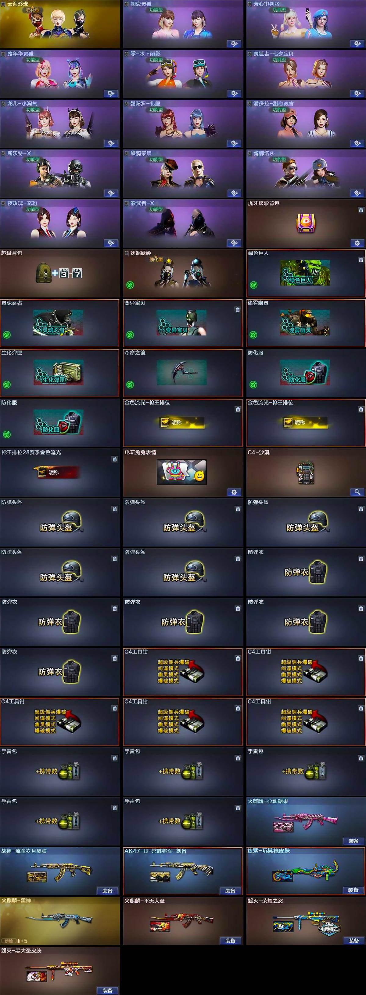 【英雄级武器】:AK47-火麒麟,M4A1-雷神,M4A1-黑骑士,M4A1-死神,AK47-黑武士,无影-神兵利器,QBZ03-金色蔷薇,AK47-B-战神,白虎-电玩蓝兔,Barrett-毁灭*2,Barrett-极光,加特林-炼狱,沙鹰-修罗,沙鹰-天神*2,屠龙*3,麒麟刺,斩神刀-雷暴,高爆手雷-雷暴,高爆手雷-竞技荣光,高爆手雷-雷霆王者-觉醒版,闪光弹-雷暴,烟雾弹-雷暴