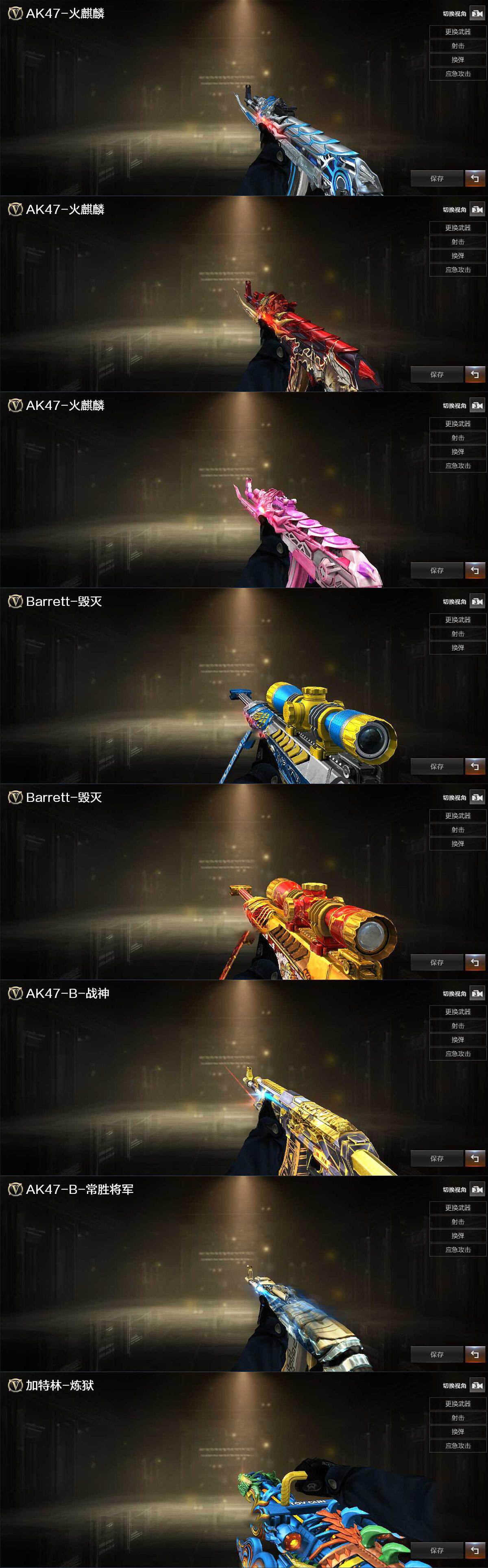 【皮肤】:火麒麟-雷神,火麒麟-平天大圣,火麒麟-心动糖果,毁灭-荣耀之怒,毁灭-黑大圣皮肤,战神-流金岁月皮肤,AK47-B-常胜将军-刘备,炼狱-玩具枪皮肤