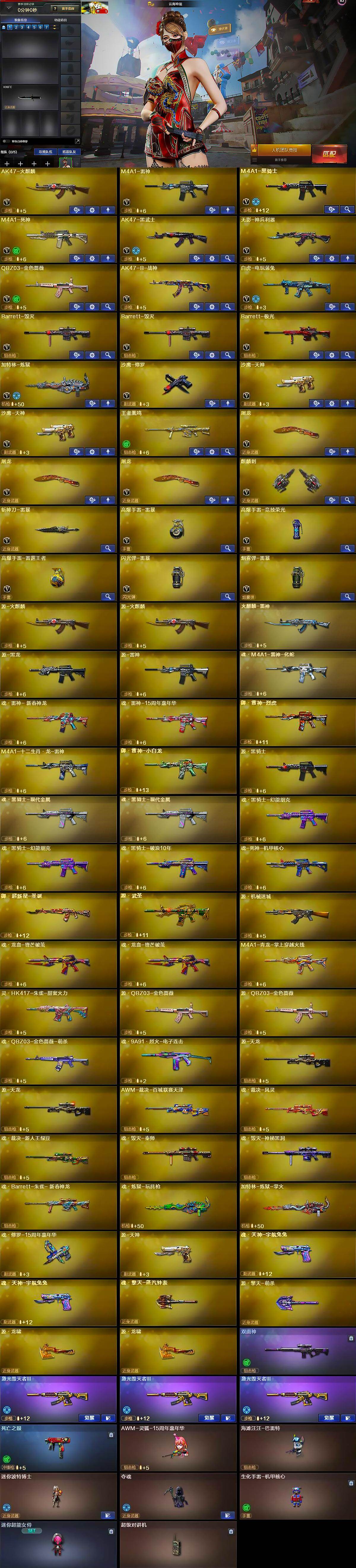 【源级武器】:源·火麒麟*2,火麒麟-雷神,源-黑龙,源·雷神,魂·M4A1-雷神-化蛇,魂·雷神-新春神龙,魂·雷神-15周年嘉年华,御·雷神-机甲刑天,御·雷神-烈虎,M4A1-十二生肖·龙-雷神,御·雷神-小白龙,源·黑骑士,魂·黑骑士-现代金属*2,魂·黑骑士-幻能朋克*2,魂·黑骑士-破浪10年,魂-死神-机甲核心,御·超新星-圣诞,源·武圣,源·机械迷城,魂·龙血-锋芒破茧*2,M4A1-青龙-掌上穿越火线,灵·HK417-朱雀-甜蜜火力,源-金色蔷薇*2,魂·QBZ03-金色蔷薇-萌杀,魂·9A91·烈火-电子连击,源·天龙*2,AWM-裁决-百城联赛天津,魂·裁决-凤灵,魂·裁决-新人王绿豆,源·毁灭,魂·毁灭-秦师,魂·毁灭-神秘黑洞,御·毁灭-黑大圣,魂·Barrett-朱雀- 新春神龙,魂·炼狱-玩具枪,加特林-炼狱-掌火,魂·修罗-15周年嘉年华,源·天神,魂·天神-阿努比斯,魂·天神-宇航兔兔*2,魂·擎天-蒸汽钟表,源·擎天-萌杀,