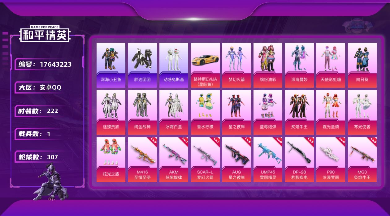 [17643223]安卓 手Q-15粉装-13特效枪-1载具-6粉色飞行器-102470热力值-24王牌印记-222套装-307枪皮