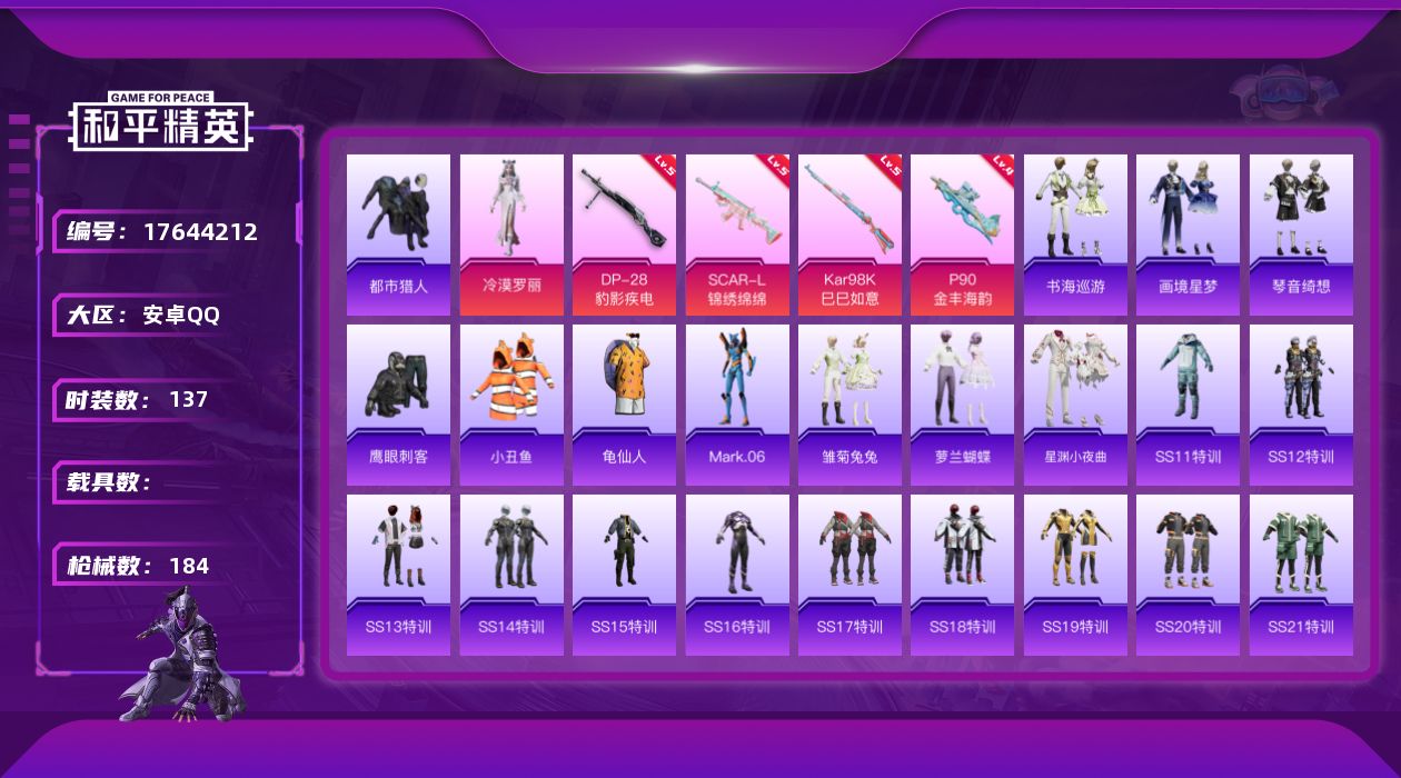 [17644212]【特价出售/店主推荐】安卓 手Q-1粉装-7特效枪-3粉色飞行器-59110热力值-15王牌印记-137套装-184枪皮【热门品类】:套装-都市猎人,套装-小丑鱼,套装-龟仙人,角色-Mark.06【粉色套装】:角色-冷漠罗丽【粉色枪皮等级】:SCAR-L-锦绣绵绵(五级),UMP45-萌骑冒险(三级),AKS-74U-森灵之息(五级),P90-金丰海韵(四级),Kar98K-巳巳如意(五级),Mk14-福马献瑞(五级),DP-28-豹影疾电(五级)【粉色枪皮】:SCAR-L-锦绣绵绵,UMP45-萌骑冒险,AKS-74U-森灵之息,P90-金丰海韵,Kar98K-巳巳如意,Mk14-福马献瑞,DP-28-豹影疾电【粉色飞行器】:炫彩糖果飞行器,星夜魔法师飞行翼,极意拳锋飞行器