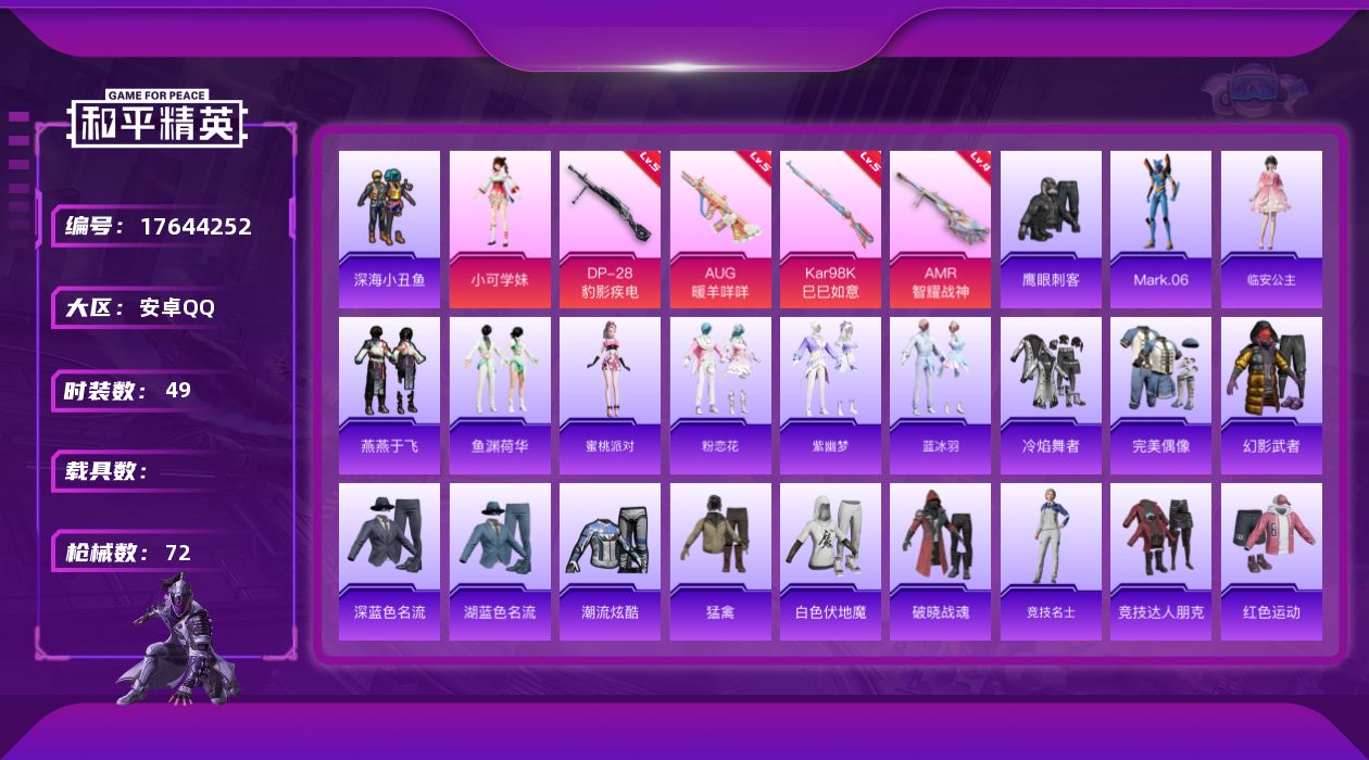 - [17583141]【1229】安卓 手Q-4粉装-7特效枪-1载具-0粉色飞行器-52448热力值-6王牌印记-128套装-171枪皮 【热门品类】:套装-龟仙人,套装-粉红小猪,角色-Mark.06 【粉色载具】:永恒黄蜂 【粉色套装】:套装-创世·救赎,角色-狂花道·不知火舞,角色-千金淑猫 【粉色枪皮等级】:SCAR-L-锦绣绵绵(五级),M416-电玩时刻(五级),GROZA-镜光银凌(五级),AUG-暖羊咩咩(五级),P90-金丰海韵(七级),Kar98K-巳巳如意(五级),DP-28-千金淑猫(四级) 【粉色枪皮】:SCAR-L-锦绣绵绵,M416-电玩时刻,GROZA-镜光银凌,AUG-暖羊咩咩,P90-金丰海韵,Kar98K-巳巳如意,DP-28-千金淑猫 【粉色降落伞】:洛神天依降落伞,旋转彩虹降落伞,第五大道降落伞,精灵梦叶罗丽降落伞,魔法神域降落伞,时空协奏降落伞,拳皇·狂花道降落伞,千金淑猫降落伞,临安公主降落伞,幻影飞狐降落伞 【稀有套装】:套装-龟仙人,套装-巳巳如意,套装-雏菊兔兔,套装-萝兰蝴蝶,套装-小熊娃娃,角色-多纳泰罗,角色-狂花道·娜可露露,角色-狂花道·雅典娜,套装-糖糖葫芦,套装-青团波波,套装-棉花软糖,角色-都市丽猫,角色-怀庆长公主,套装-燕燕于飞,套装-鱼渊荷华,角色-乐音 【稀有枪皮】:AKM-彩虹符号,AKM-灼热熔岩,AKM-破晓战魂,AKM-虎虎生威,AKM-霓虹街区,AKM-龙的传人,M16A4-幻世战舞者,M16A4-千金淑猫,SCAR-L-玉兔迎春,SCAR-L-红色方程式,M416-糯团青竹,M416-红色方程式,M416-蓝色火焰,GROZA-影袭,GROZA-懵萌河马,GROZA-田园牧歌,AUG-天降萌叽,AUG-甜蜜菠萝,AUG-耀粉歌者,M762-天降萌叽,Mk47-妙红点点,Mk47-洛神天依,G36C-懵萌河马,AC-VAL-天降萌叽,AC-VAL-彩虹甜喵,AC-VAL-快闪甜心,蜜獾-天降萌叽,蜜獾-娇憨猪猪,蜜獾-绯穹魔姬,UZI-啾咪啾咪,UZI-天降萌叽,UZI-娇憨猪猪,UZI-红色方程式,UMP45-繁龙极客,UMP45-涂山之恋,UMP45-蓝色火焰,Vector-焰鹰斗篷,Vector-生命誓言,Vector-田园牧歌,汤姆逊-耀粉歌者,P90-快闪甜心,P90-巳巳如意,Kar9