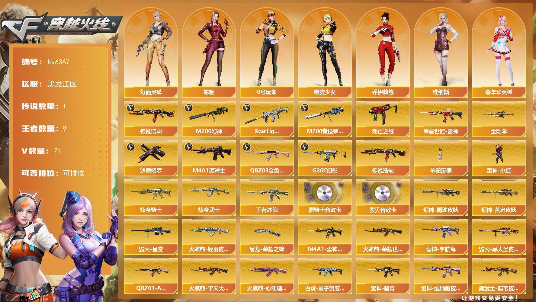 [17645277]【ky6367】黑龙江区-77V-9王者武器数-2炫金武器数 【传说武器】:传说浩劫 【传说角色】:传说艾莉莎 【热门武器】:传说浩劫,G36C-幻影,QBZ03-金色蔷薇,Scar Light-白虎,M200-幻神,M200-竞技荣光,死亡之眼,荣耀世冠-雷神,M4A1-黑骑士,羊驼玩偶,雷神-小红,沙鹰-修罗,金刚伞 【王者炫金武器】:王者冰魄,炫金骑士,炫金武士 【音效卡】:M4A1-黑骑士音效卡,Barrett-毁灭音效卡 【皮肤】:M200-幻神-黄忠皮肤,幻神-周瑜皮肤,白虎-量子聚变 皮肤,QBZ03-AG-CFPLS19冠军,雷神-暗月,M4A1-雷神-CFS 2019,雷神-宇航兔皮肤,雷神-维纳斯皮肤,火麒麟-轻羽皮肤,火麒麟-平天大圣,火麒麟-荣耀世冠AG,火麒麟-心动糖果,毁灭-星空,毁灭-黑大圣皮肤,黑武士-典韦皮肤,幻影-量子聚变 皮肤,战神-粉色甜心皮肤*2,战神-紫绶金章皮肤,AK47-B-常胜将军-曹操,AK47-B-常胜将军-刘备,AK47-B-常胜将军-孙权,修罗-能量核心,屠龙-荣耀之锋 【角色】:王者-葵-貂蝉,乔伊教练,幻面灵狐,暗夜-X,电竞少女,芳心审判者,飞虎队-X,嘉年华灵狐,0号玩家,灵狐者-X,龙儿,龙儿-小淘气,曼陀罗-X,潘多拉-X,潘多拉-甜心教官,邱刚敖,青霞仙子,蛇姬,斯沃特-X,维纳斯,雪莉杨-摸金校尉,职业选手 【人偶武器】:雷神-小红,AWM-灵狐-15周年嘉年华,M37-葵,迷你深渊冰龙,夺魂,迷你牛牛,深渊终结者手雷,闪光弹-小乔,闪光弹-貂蝉,高爆手雷-大乔,迷你艾比,迷你超能女侍,迷你巨石泰坦-魔花研究所 【暴走生化】:死亡之眼 【挑战大师】:激光毁灭者III-白马银枪,神圣爆裂者-末日III,阐释者III 【英雄级武器】:AK47-火麒麟*2,M4A1-雷神,M4A1-黑骑士,AK47-黑武士,AK12-天启,Scar Light-白虎,无影-神兵利器,G36C-幻影,黑武士-锦绣游龙,QBZ191-银翼,QBZ03-金色蔷薇,9A91-烈火,烈火-动感闪耀,AK-47-猩红传说,AK47-B-战神,黑骑士-海王,AK47-B-常胜将军,M4A1-雷霆王者-觉醒版,荣耀世冠-雷神,AK47-B-身先士卒,AK47-B-战士,Barrett-毁灭,Barrett-极光,M200-幻神,