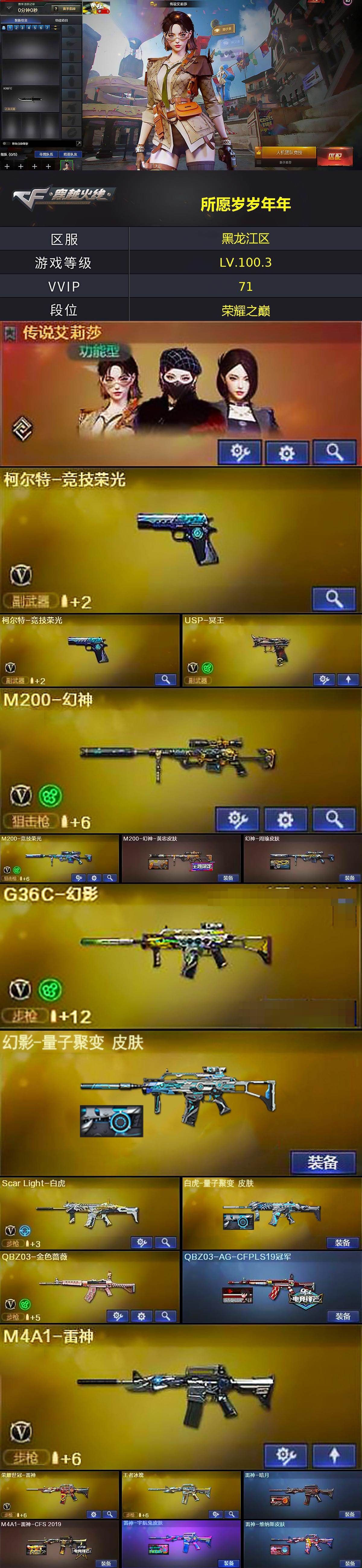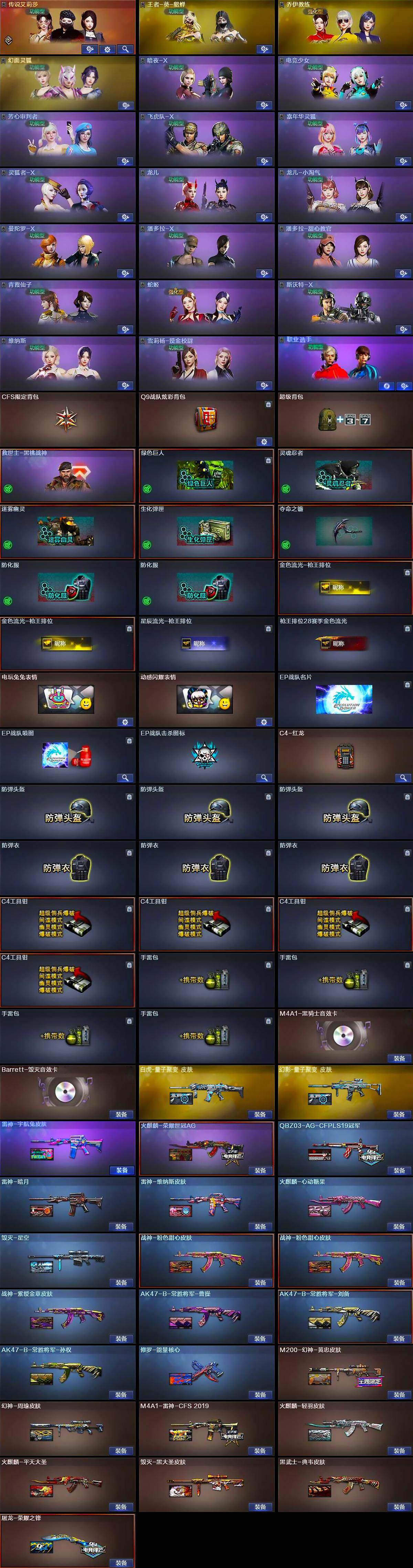 【皮肤】:M200-幻神-黄忠皮肤,幻神-周瑜皮肤,白虎-量子聚变 皮肤,QBZ03-AG-CFPLS19冠军,雷神-暗月,M4A1-雷神-CFS 2019,雷神-宇航兔皮肤,雷神-维纳斯皮肤,火麒麟-轻羽皮肤,火麒麟-平天大圣,火麒麟-荣耀世冠AG,火麒麟-心动糖果,毁灭-星空,毁灭-黑大圣皮肤,黑武士-典韦皮肤,幻影-量子聚变 皮肤,战神-粉色甜心皮肤*2,战神-紫绶金章皮肤,AK47-B-常胜将军-曹操,AK47-B-常胜将军-刘备,AK47-B-常胜将军-孙权,修罗-能量核心,屠龙-荣耀之锋