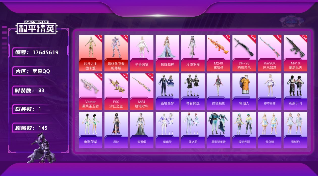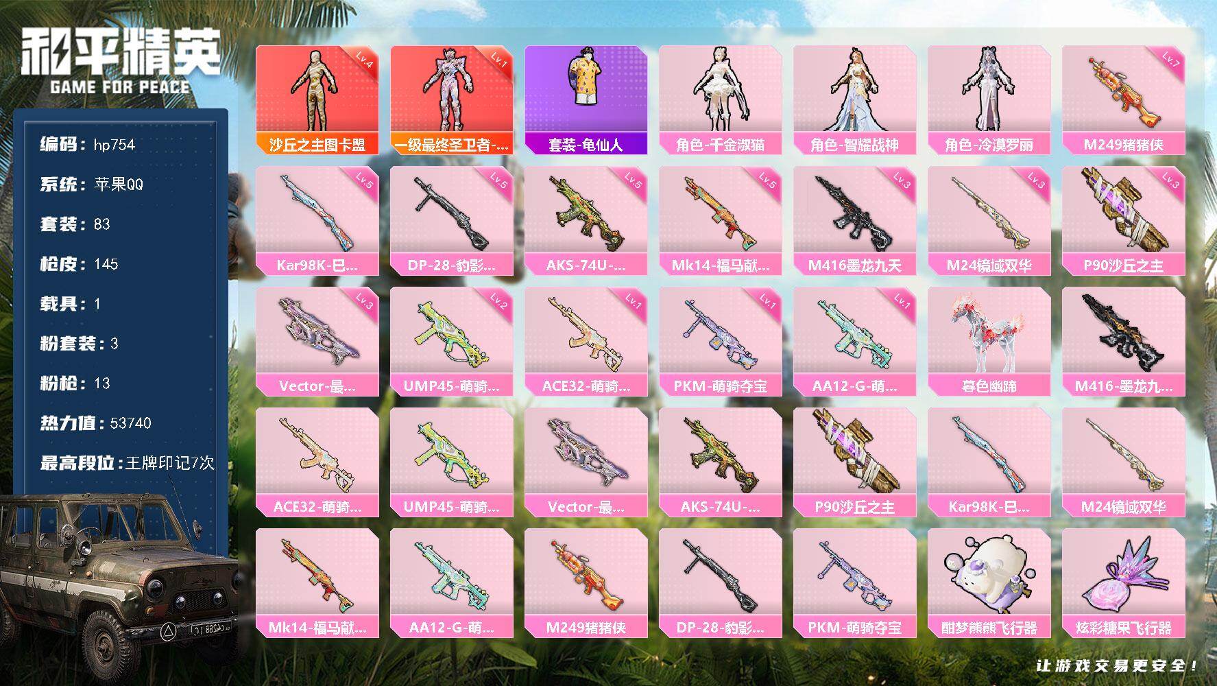 [17645619]苹果 手Q-2神装-3粉装-13特效枪-1载具-9粉色飞行器-53740热力值-7王牌印记-83套装-145枪皮