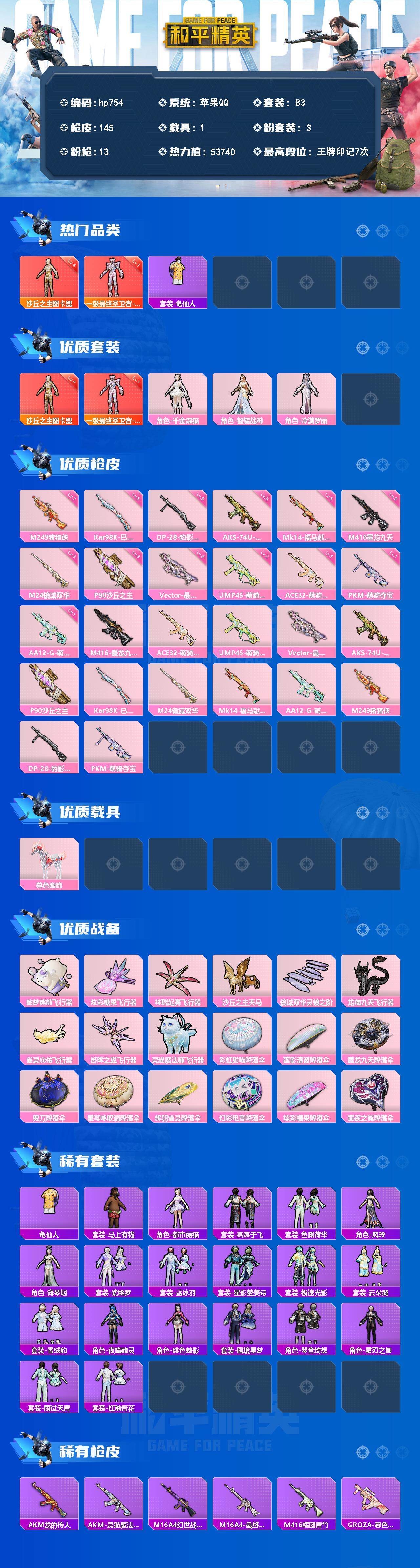 [17645619]苹果 手Q-2神装-3粉装-13特效枪-1载具-9粉色飞行器-53740热力值-7王牌印记-83套装-145枪皮 【红色神装等级】:最终圣卫者-帕修斯(一级),沙丘之主-图卡盟(四级) 【红色角色神装】:最终圣卫者-帕修斯,沙丘之主-图卡盟 【热门品类】:套装-龟仙人 【粉色套装】:角色-千金淑猫,角色-智耀战神,角色-冷漠罗丽 【粉色枪皮等级】:M416-墨龙九天(三级),ACE32-萌骑漫游(一级),UMP45-萌骑冒险(二级),Vector-最终圣卫者(三级),AKS-74U-森灵之息(五级),P90-沙丘之主(三级),Kar98K-巳巳如意(五级),M24-镜域双华(三级),Mk14-福马献瑞(五级),AA12-G-萌骑幻想(一级),M249-猪猪侠(七级),DP-28-豹影疾电(五级),PKM-萌骑夺宝(一级) 【粉色载具】:暮色幽蹄 【粉色枪皮】:M416-墨龙九天,ACE32-萌骑漫游,UMP45-萌骑冒险,Vector-最终圣卫者,AKS-74U-森灵之息,P90-沙丘之主,Kar98K-巳巳如意,M24-镜域双华,Mk14-福马献瑞,AA12-G-萌骑幻想,M249-猪猪侠,DP-28-豹影疾电,PKM-萌骑夺宝 【粉色飞行器】:酣梦熊熊飞行器,炫彩糖果飞行器,祥瑞起舞飞行器,沙丘之主天马,镜域双华-灵镜之阶,龙翔九天飞行器,雀灵庇佑飞行器,终晖之翼飞行器,灵猫魔法师飞行器 【粉色降落伞】:彩虹甜喵降落伞,莲影清波降落伞,墨龙九天降落伞,鬼刀降落伞,星穹咏叹调降落伞,辉羽雀灵降落伞,幻彩电音降落伞,炫彩糖果降落伞,罪夜之冕降落伞 【稀有套装】:套装-龟仙人,套装-雪国风尚,套装-炫彩糖果,套装-马上有钱,角色-都市丽猫,套装-燕燕于飞,套装-鱼渊荷华,角色-风玲,角色-海琴烟,套装-紫幽梦,套装-蓝冰羽,套装-星影赞美诗,套装-极速光影,套装-云朵鹅,套装-雪绒豹,角色-夜瞳黯灵,角色-绯色魅影,套装-画境星梦,套装-琴音绮想,角色-霜刃之御,套装-雨过天青,套装-红釉青花 【稀有枪皮】:AKM-龙的传人,AKM-灵猫魔法师,M16A4-幻世战舞者,M16A4-最终圣卫者,M416-糯团青竹,GROZA-暮色玫影,AUG-青春冒险家,AUG-魔法学院,M762-云朵鹅,Mk47-摩登王国,Mk47-洛神天依,G36C-灵驹仙姬,AC-VAL-快闪