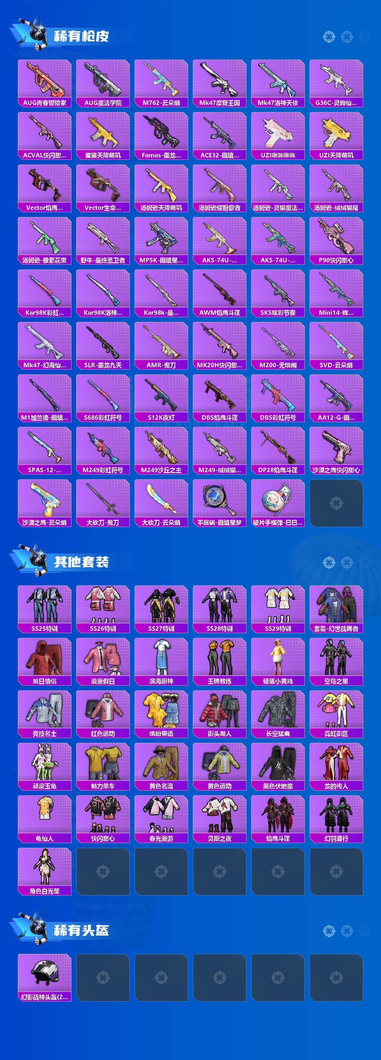 【稀有枪皮】:AKM-龙的传人,AKM-灵猫魔法师,M16A4-幻世战舞者,M16A4-最终圣卫者,M416-糯团青竹,GROZA-暮色玫影,AUG-青春冒险家,AUG-魔法学院,M762-云朵鹅,Mk47-摩登王国,Mk47-洛神天依,G36C-灵驹仙姬,AC-VAL-快闪
