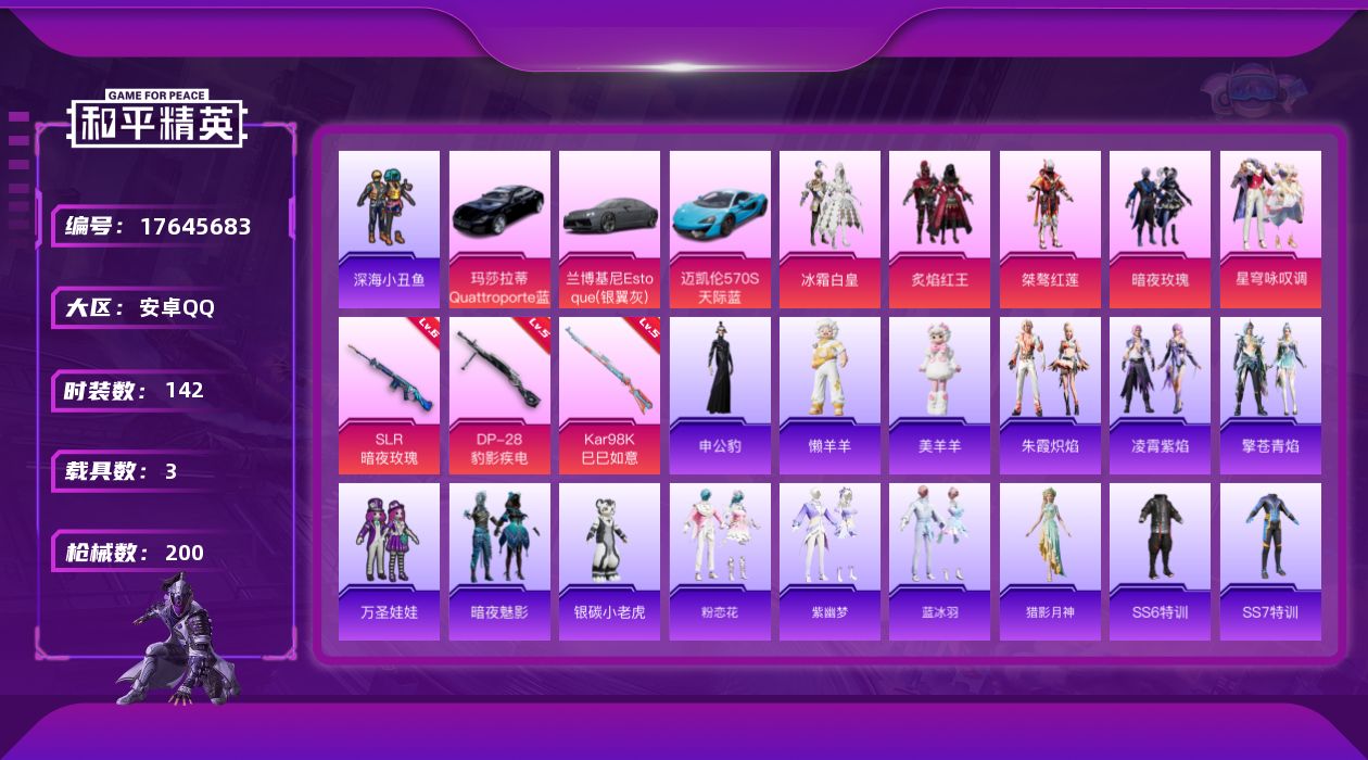 [17645683]安卓 手Q-5粉装-5特效枪-3载具-2粉色飞行器-61178热力值-2王牌印记-142套装-200枪皮 【热门品类】:套装-深海小丑鱼 【粉色套装】:粉装-冰霜白皇,粉装-炙焰红王,粉装-桀骜红莲,粉装-暗夜玫瑰,粉装-星穹咏叹调 【粉色枪皮等级】:ACE32-萌骑漫游(三级),Kar98K-巳巳如意(五级),Mk14-福马献瑞(五级),SLR-暗夜玫瑰(六级),DP-28-豹影疾电(五级) 【粉色载具】:兰博基尼Estoque(银翼灰),玛莎拉蒂Quattroporte(夜幕蓝),迈凯伦570S(天际蓝) 【粉色枪皮】:ACE32-萌骑漫游,Kar98K-巳巳如意,Mk14-福马献瑞,SLR-暗夜玫瑰,DP-28-豹影疾电 【粉色飞行器】:炫彩糖果飞行器,古堡领主飞行器 【粉色降落伞】:马卡龙降落伞,星之彼岸降落伞,暗夜玫瑰降落伞,洛神天依降落伞,海渊国主降落伞,智耀战神降落伞,荧海星豚降落伞,炫彩糖果降落伞 【稀有套装】:套装-雪国风尚,套装-马上来财,套装-粉恋花,套装-紫幽梦,套装-蓝冰羽,角色-猎影月神,套装-朱霞炽焰,套装-凌霄紫焰,套装-擎苍青焰,玩偶服-懒羊羊,玩偶服-美羊羊,角色-申公豹 【稀有枪皮】:AKM-PEL轰鸣竞梦者,AKM-环太平洋,AKM-破晓战魂,AKM-萌趣颜团子,AKM-虎虎生威,AKM-龙的传人,M16A4-幻世战舞者,M16A4-机械英豪,M16A4-红色方程式,SCAR-L-暗夜玫瑰,SCAR-L-炫彩节奏,SCAR-L-玉兔迎春,SCAR-L-红色方程式,SCAR-L-银碳小老虎,M416-夜灯,M416-红色方程式,M416-绯红前夜,M416-蓝色火焰,GROZA-懵萌河马,GROZA-田园牧歌,AUG-幻影战神,AUG-耀粉歌者,AUG-青春冒险家,QBZ-彩虹符号,QBZ-银碳小老虎,M762-天降萌叽,M762-奇异狩猎者,M762-彩虹符号,M762-牛气冲天,M762-瑞龙福将,Mk47-妙红点点,Mk47-洛神天依,Mk47-青春冒险家,G36C-不夜海上花,G36C-懵萌河马,G36C-时空追击者,G36C-暗夜玫瑰,AC-VAL-天降萌叽,ARX-凌霄紫焰,UZI-众神之王,UZI-古堡领主,UZI-天降萌叽,UZI-炫彩节奏,UZI-红色方程式,UMP45-仲夏莫吉托,UMP45-时空追击者,U