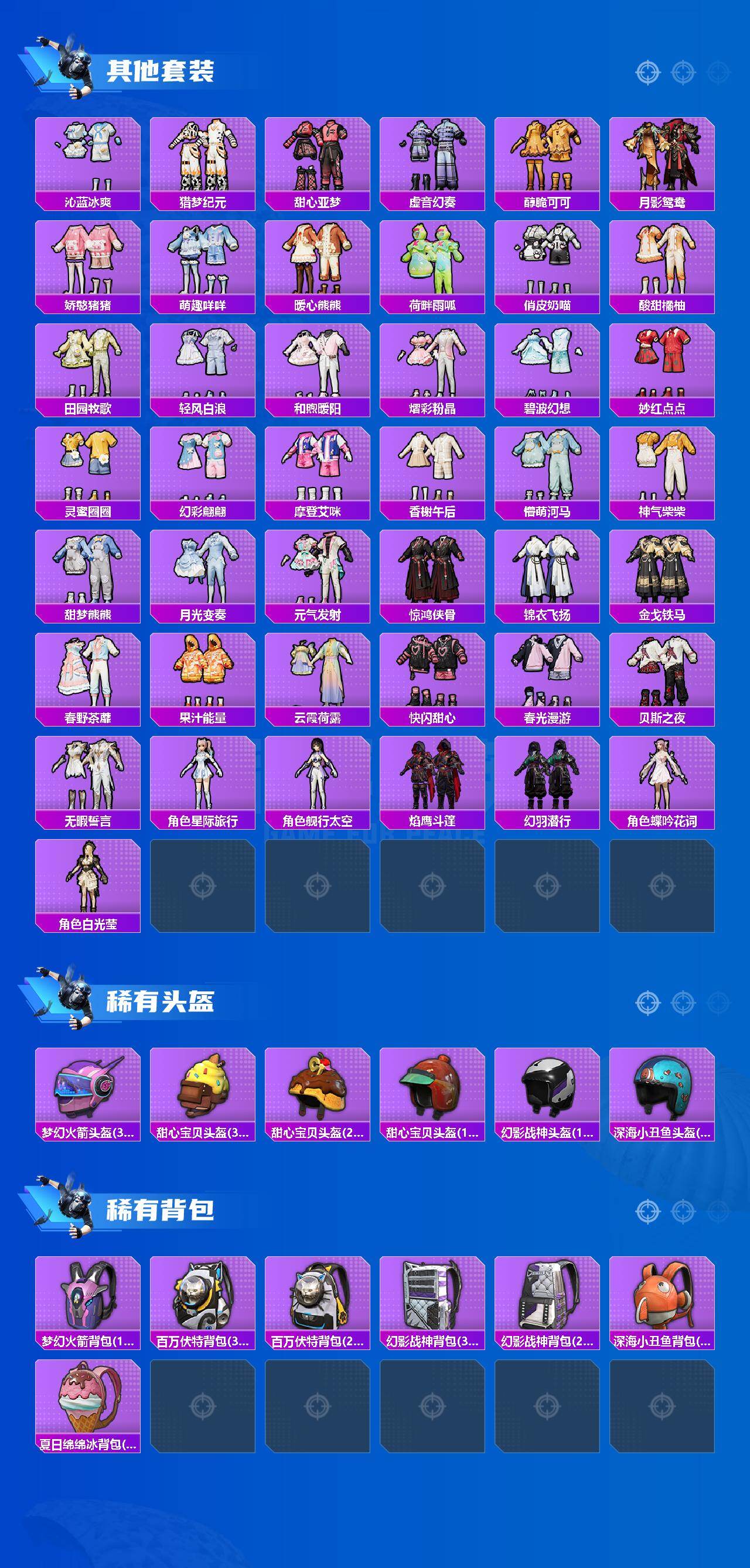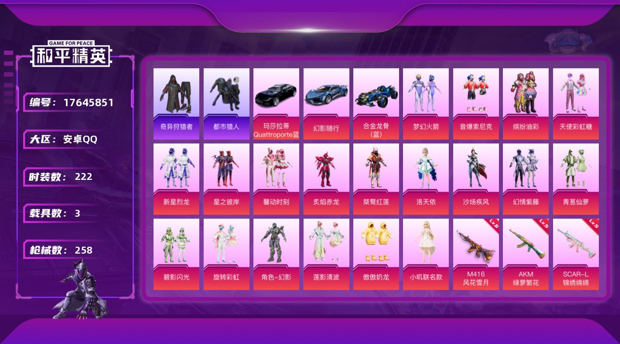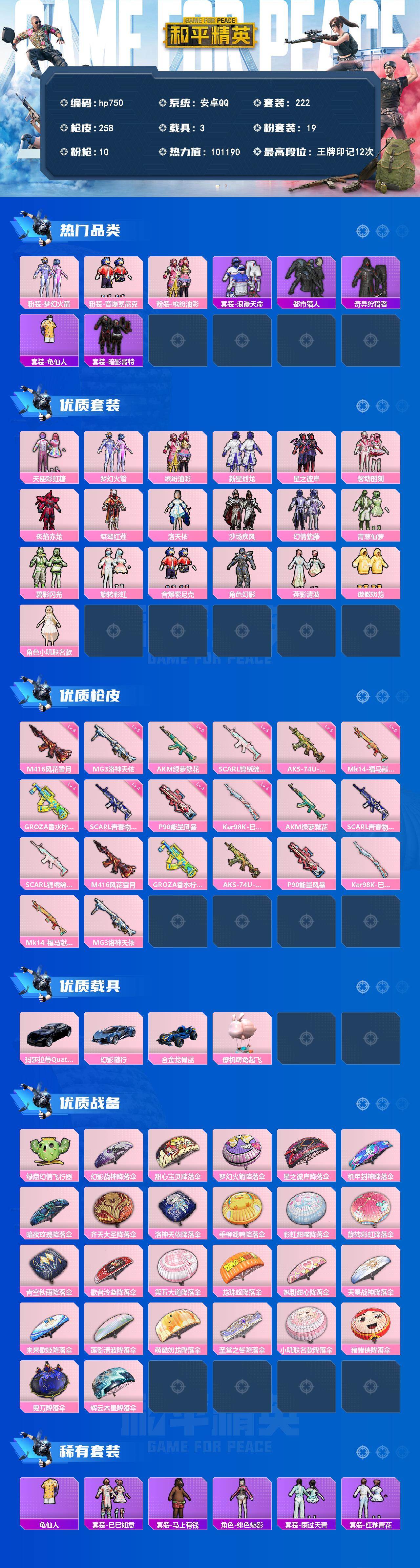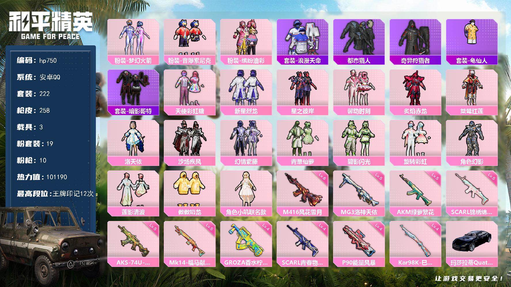 [17645851]安卓 手Q-19粉装-10特效枪-3载具-2粉色飞行器-101190热力值-12王牌印记-222套装-258枪皮 【热门品类】:粉装-梦幻火箭,粉装-音爆索尼克,粉装-缤纷油彩,套装-浪漫天命,套装-都市猎人,套装-奇异狩猎者,套装-龟仙人,套装-暗影哥特 【粉色套装】:粉装-天使彩虹糖,粉装-梦幻火箭,粉装-缤纷油彩,粉装-新星烈龙,粉装-星之彼岸,粉装-馨动时刻,粉装-炙焰赤龙,粉装-桀骜红莲,角色-洛天依,粉装-沙场疾风,粉装-幻情紫藤,粉装-青葱仙萝,粉装-碧影闪光,粉装-旋转彩虹,粉装-音爆索尼克,角色-幻影,粉装-莲影清波,粉装-傲傲奶龙,角色-小叽联名款 【粉色枪皮等级】:AKM-绿萝繁花(五级),SCAR-L-青春物语(四级),SCAR-L-锦绣绵绵(五级),M416-风花雪月(六级),GROZA-香水柠檬(四级),AKS-74U-森灵之息(五级),P90-能量风暴(四级),Kar98K-巳巳如意(四级),Mk14-福马献瑞(五级),MG3-洛神天依(五级) 【粉色载具】:玛莎拉蒂Quattroporte(夜幕蓝),幻影随行,合金龙骨(蓝),僚机-萌兔起飞 【粉色枪皮】:AKM-绿萝繁花,SCAR-L-青春物语,SCAR-L-锦绣绵绵,M416-风花雪月,GROZA-香水柠檬,AKS-74U-森灵之息,P90-能量风暴,Kar98K-巳巳如意,Mk14-福马献瑞,MG3-洛神天依 【粉色飞行器】:绿意幻情飞行器 【粉色降落伞】:幻影战神降落伞,甜心宝贝降落伞,梦幻火箭降落伞,星之彼岸降落伞,机甲封神降落伞,暗夜玫瑰降落伞,齐天大圣降落伞,洛神天依降落伞,垂柳戏鸭降落伞,彩虹甜喵降落伞,旋转彩虹降落伞,青空秋雨降落伞,歌者泠鸢降落伞,第五大道降落伞,龙珠超降落伞,飒粉甜心降落伞,天星战神降落伞,未来歌姬降落伞,莲影清波降落伞,萌酷奶龙降落伞,圣堂之誓降落伞,小叽联名款降落伞,猪猪侠降落伞,鬼刀降落伞,辉云木星降落伞 【稀有套装】:套装-龟仙人,套装-巳巳如意,套装-马上有钱,角色-绯色魅影,套装-雨过天青,套装-红釉青花 【稀有枪皮】:AKM-彩虹符号,AKM-影袭,AKM-环太平洋,AKM-萌趣颜团子,AKM-虎虎生威,AKM-霓虹街区,AKM-龙的传人,M16A4-天使羽翼,M16A4-幻世战舞者,M16A4-甜心亚梦,M16A4-红色方程式,M