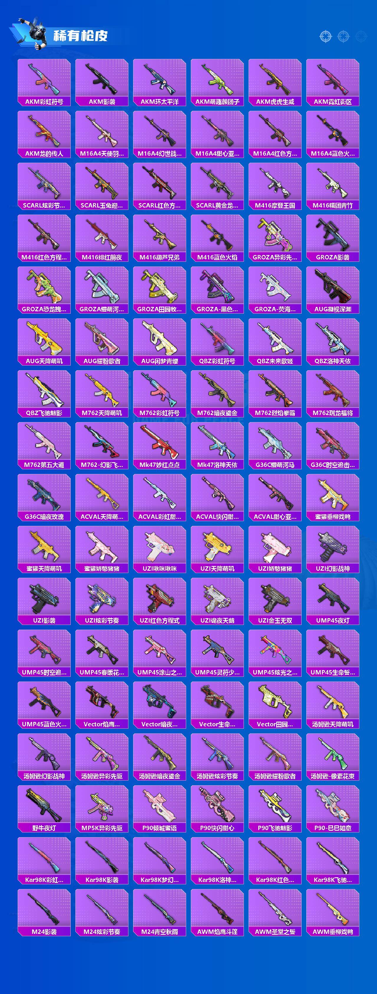 【稀有枪皮】:AKM-彩虹符号,AKM-影袭,AKM-环太平洋,AKM-萌趣颜团子,AKM-虎虎生威,AKM-霓虹街区,AKM-龙的传人,M16A4-天使羽翼,M16A4-幻世战舞者,M16A4-甜心亚梦,M16A4-红色方程式,M