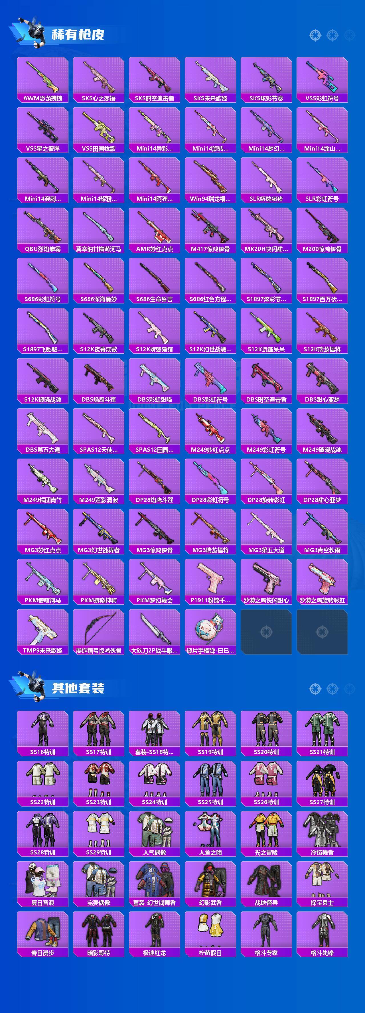 - [14330618]秒换绑 总资产95 10008k哈伏币-41m流动资产-60烽火等级-铂金-45战场等级-军士长 【干员外观】:露娜-黑·天际线,蜂医-送葬人·无题密令,深蓝-不破誓约,红狼-电锯惊魂 【近战皮肤】:近战-信条,近战-黑鹰 【传说外观】:M4A1突击步枪-阿米娅,ASh-12战斗步枪-鹅鸭杀,SG552突击步枪-运动员,AK-12突击步枪-特斯拉线圈,SCAR-H战斗步枪-启航,G3战斗步枪-骑士,CAR-15突击步枪-阿米娅,腾龙突击步枪-捞点薯条,KC17突击步枪-电锯惊魂,P90冲锋枪-信条,Vector冲锋枪-能天使-午夜邮差,UZI冲锋枪-特斯拉线圈,SR-3M紧凑突击步枪-特斯拉线圈,勇士冲锋枪-能天使-午夜邮差,QCQ171冲锋枪-鹅鸭杀,725双管霰弹枪-送葬人-无题密令,M250通用机枪-骑士之心,QJB201轻机枪-鹅鸭杀,SR-25射手步枪-信条,R93狙击步枪-维什戴尔,AWM狙击步枪-捞点薯条,93R-捞点薯条,复合弓-黑·天际线 【史诗外观】:ASh-12战斗步枪-无极限,M16A4突击步枪-竞赛选手,AUG突击步枪-蝮蛇,SCAR-H战斗步枪-囚徒,G3战斗步枪-流沙送葬,PTR-32突击步枪-工业狂潮,AS Val突击步枪-典狱官,AS Val突击步枪-百步穿杨,腾龙突击步枪-无垢,K437突击步枪-守护者,MP5冲锋枪-战术竞备,MP5冲锋枪-竞技风,P90冲锋枪-莫斯提马,Vector冲锋枪-猎鳄行动,SR-3M紧凑突击步枪-荒野求生,SR-3M紧凑突击步枪-战术竞备,勇士冲锋枪-深海恐惧,勇士冲锋枪-工业狂潮,MP7冲锋枪-无垢,MP7冲锋枪-守护者,PKM通用机枪-蝮蛇,PKM通用机枪-荒野求生,Mini-14射手步枪-守护者,SVD狙击步枪-荒野求生,PSG-1射手步枪-无垢,SV-98狙击步枪-林中猎手,M700狙击步枪-竞技风,M700狙击步枪-百步穿杨,AWM狙击步枪-无极限,复合弓-守护者 【稀有外观】:AKM突击步枪-战术演练,AKM突击步枪-肃杀,QBZ95-1突击步枪-公平竞技,ASh-12战斗步枪-繁盛,K416突击步枪-虎啸,M7战斗步枪-精英联盟,M7战斗步枪-捣蛋鬼,SCAR-H战斗步枪-荣耀列队,SCAR-H战斗步枪-黄昏,G3战斗步枪-战术演练,G3战斗步枪-主宰,腾龙突击步枪-雪崩,腾龙突击步枪