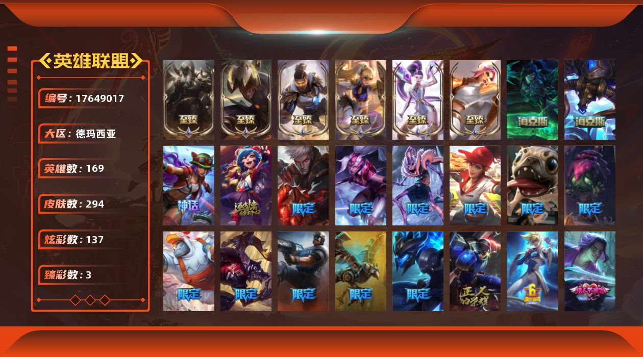 [17649017]未定级段位-169英雄-294皮肤-137炫彩-0终极-10神话-47限定-31传说-77史诗
