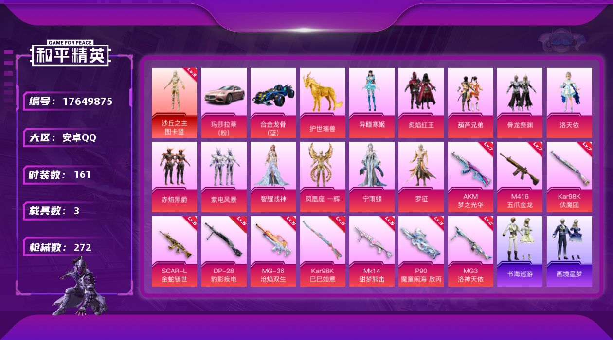 - [12949830]素材身法号【特价急出/详情看图】:苹果 手Q-1神装-10粉装-14特效枪-4载具-12粉色飞行器-6.3w热力值-6王牌印记-105套装-163枪皮【红色神装等级】:镜域双华-欧若拉(三级)【粉色载具】:虚妄之影(炫耀紫),萌喵橘座,晶梦灵驹,冰绡玉鳞【粉色套装】:粉装-蝶舞迷情,粉装-仲夏莫吉托,角色-千金淑猫,角色-晶梦幻蝶,粉装-幻彩电音,角色-狂魅哈莉,角色-冷漠罗丽,角色-绯月迷踪,角色-荧海星豚,角色-花灵【粉色枪皮等级】:SCAR-L-金蛇镇世(三级),M416-墨龙九天(三级),AUG-圣斗士星矢(四级),蜜獾-荧海星豚(四级),Vector-最终圣卫者(三级),P90-沙丘之主(三级),P90-冷漠罗丽(五级),Kar98K-巳巳如意(五级),AMR-鸢尾晶梦(五级),DP-28-千金淑猫(四级),DP-28-豹影疾电(五级),平底锅-仲夏莫吉托(二级),烟雾弹-电雾迷城(四级)【粉色飞行器】:沙丘之主天马,镜域双华-灵镜之阶,龙翔九天飞行器,凤舞九天飞行器,戏水时光飞行器,雀灵庇佑飞行器,终晖之翼飞行器,绯月迷踪飞行器,灵猫魔法师飞行器,桃源时光飞行器,灵珠游龙飞行器