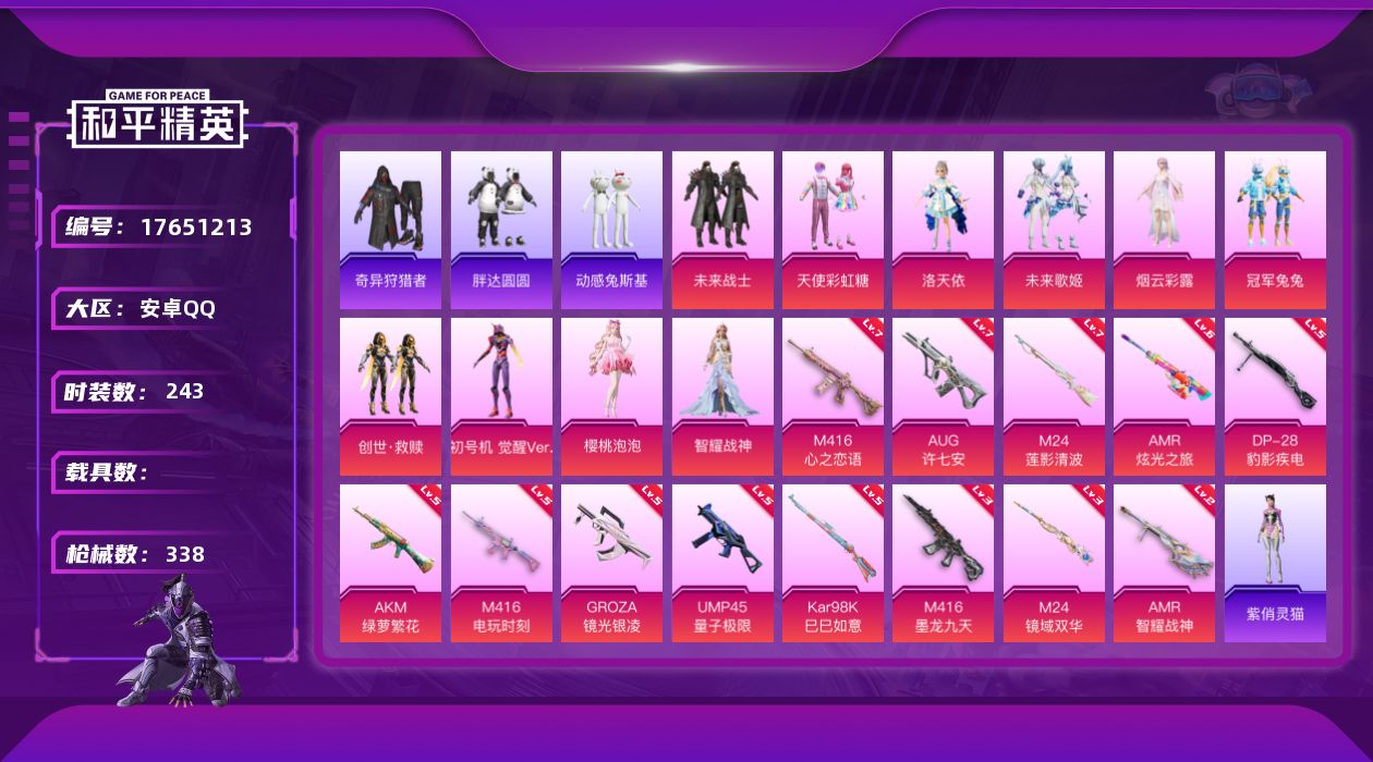 安卓 手Q-10粉装-16特效枪-0载具-7粉色飞行器-103585热力值-21王牌印记-243套装-338枪皮