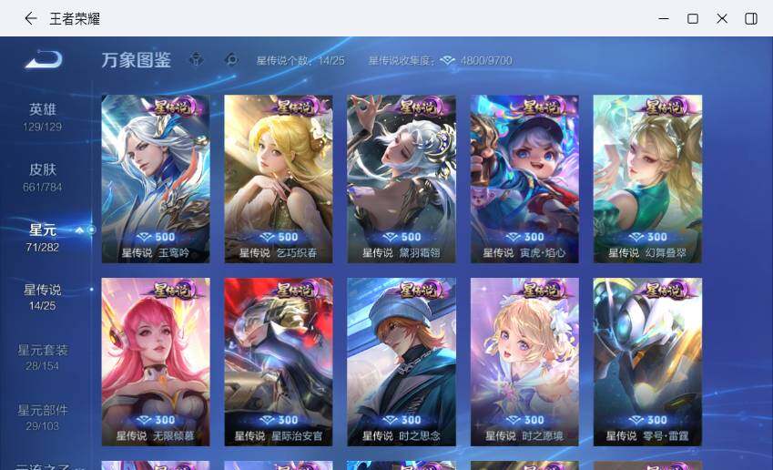 孙膑妖精王,扁鹊炼金王,虞姬凯尔特女王,白起狰,太乙真人饕餮,曹操烛龙,芈月重明,典韦穷奇,狂铁御狮,米莱狄御霄,牛魔御旌,盾山御銮,夏侯惇朔风刀,明世隐疑决卦,老夫子醍醐杖,鬼谷子原初探秘者,狄仁杰万华元夜,程咬金演武夺筹,钟馗驱傩正仪,苏烈千军破阵,吕布猎兽之王,女娲朔望之晖,鲁班七号狮舞东方,沈梦溪星空之诺,李元芳银河之约,刘邦夺宝奇兵,马可波罗暗影游猎,蒙犽狂想玩偶喵,元歌云间偶戏,弈星混沌棋,达摩沙漠行僧,兰陵王金庭之子,沈梦溪大漠名商,李元芳云中旅人,桑启海盐诗旅,裴擒虎擒涛扼浪,鲁班大师探海日志,张良古海寻踪,项羽苍威无极,镜青焰无极