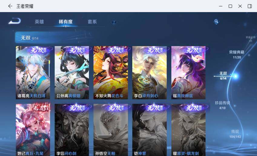 【荣耀典藏】:武则天英雄,孙悟空全息碎影,孙尚香杀手不太冷,李白鸣剑曳影,花木兰九霄神辉,关羽赤影疾锋,铠银白咏叹调,貂蝉幻阙歌,韩信弑枪猎影,虞姬神鉴启示录,瑶拾光映像,吕布千魇归渊