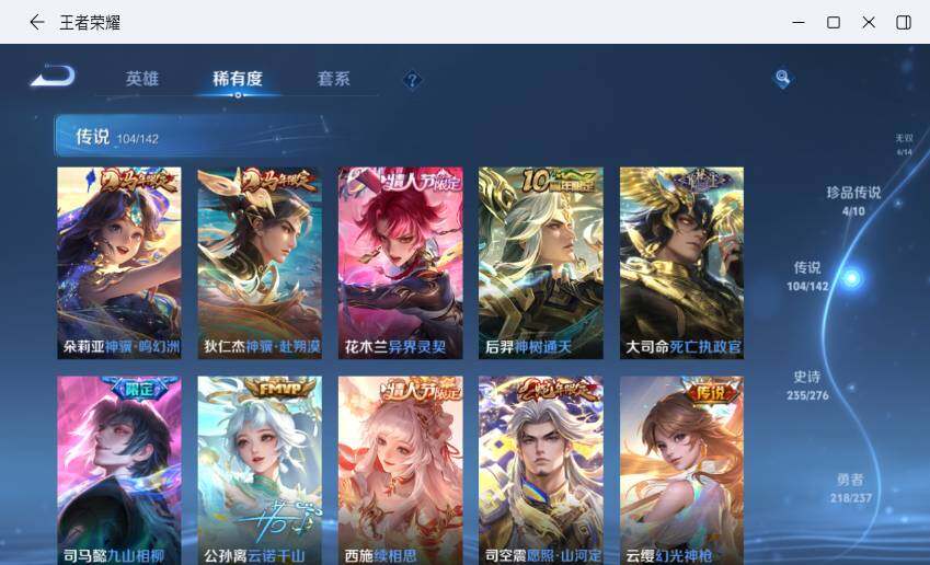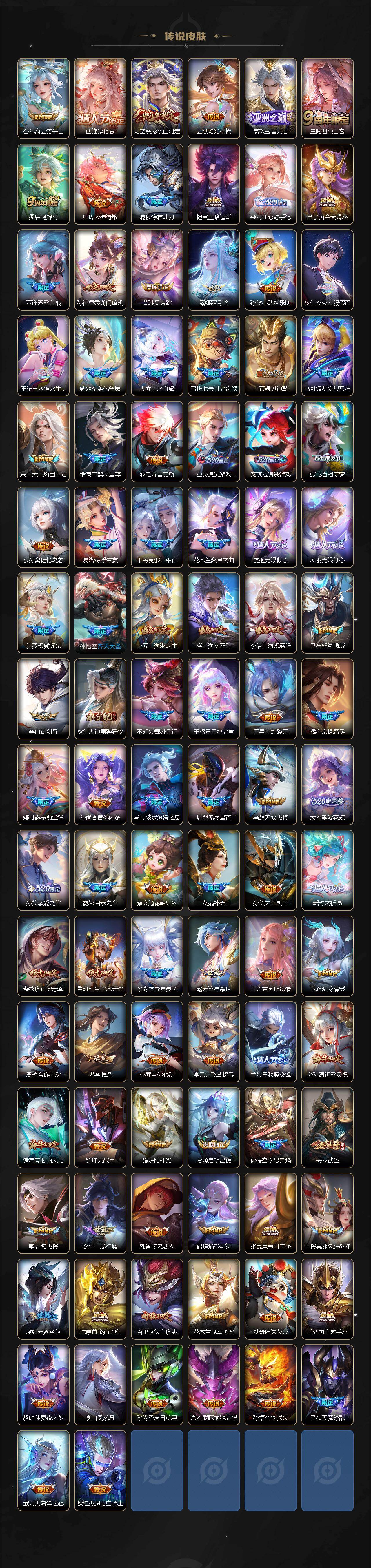 【传说皮肤】:朵莉亚神骥鸣幻洲,狄仁杰神骥赴朔漠,花木兰异界灵契,后羿神树通天,大司命死亡执政官,司马懿九山相柳,公孙离云诺千山,西施续相思,司空震愿照山河定,云缨幻光神枪,嬴政玄雷天君,王昭君映山客,桑启鸣野蒿,庄周牧神诗旅,夏侯惇霜北刀,铠冥王哈迪斯,朵莉亚心动手记,墨子黄金天蝎座,亚连落雪白狼,孙尚香乘龙问璇玑,艾琳觅芳踪,露娜霜月吟,孙膑小动物乐团,狄仁杰夜礼服假面,王昭君永恒水手月亮,甄姬至美化雀舞,大乔时之奇旅,鲁班七号时之奇旅,吕布遇见神鼓,马可波罗妄想实况,东皇太一灼幽烈阳,诸葛亮鹤羽星尊,澜电玩雷克斯,亚瑟追逃游戏,安琪拉追逃游戏,张飞百相守梦,公孙离记忆之芯,夏洛特浮生妄,干将莫邪画中仙,花木兰燃星之曲,虞姬无限倾心,项羽无限倾心,伽罗炽翼辉光,孙悟空齐天大圣,小乔山海琳琅生,曜山海苍雷引,李信山海炽霜斩,吕布怒海麟威,李白诗剑行,狄仁杰神器狴犴令,不知火舞绯月行,王昭君星穹之声,百里守约碎云,橘右京枫霜尽,娜可露露前尘镜,