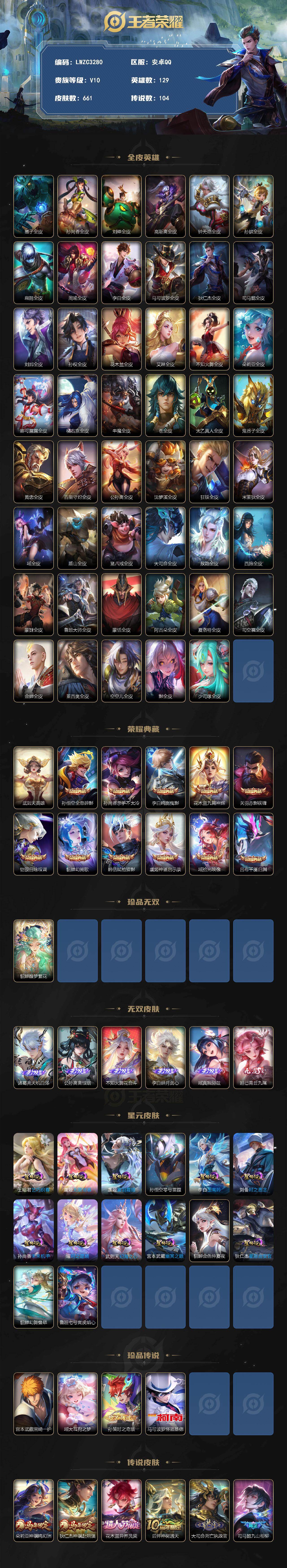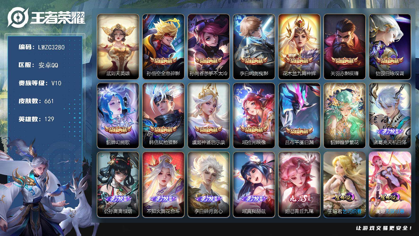 [17653561]可二次【特价出售/店主推荐/6市标/38段发育/32段打野】:安卓Q-V10-最强王者段位-129英雄-661皮肤-11典藏皮肤-1典藏英雄-1珍品无双-6无双-4珍品传说-14星元-104传说-233史诗