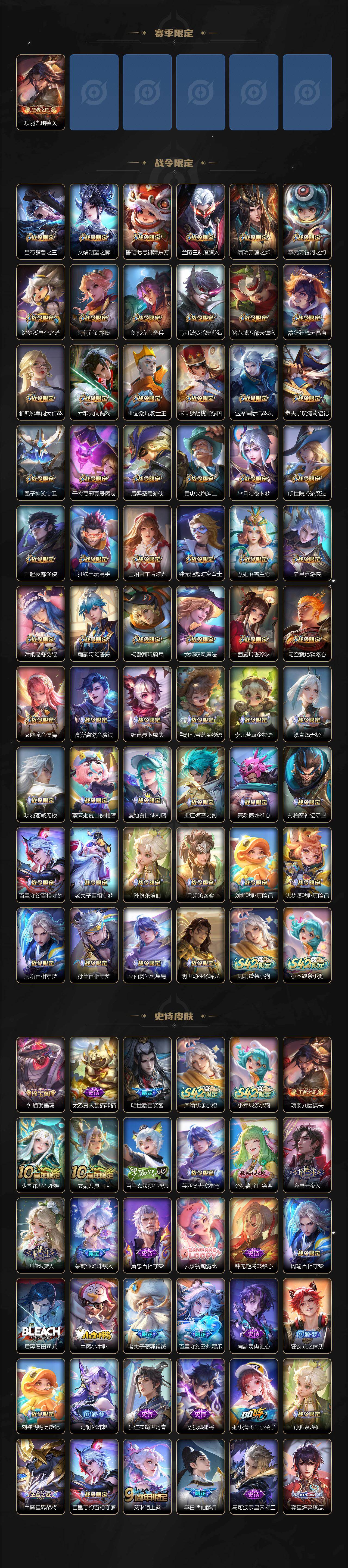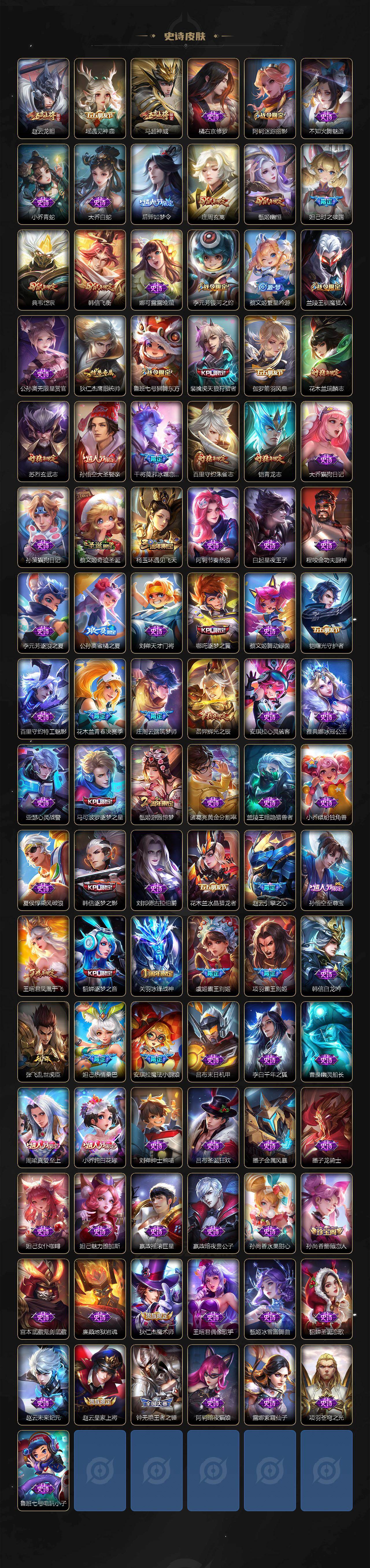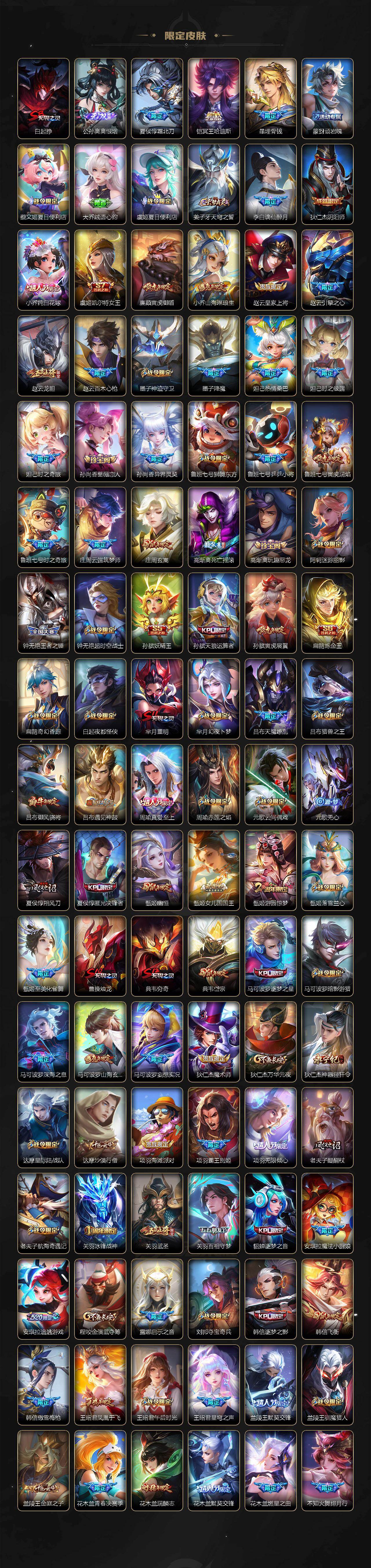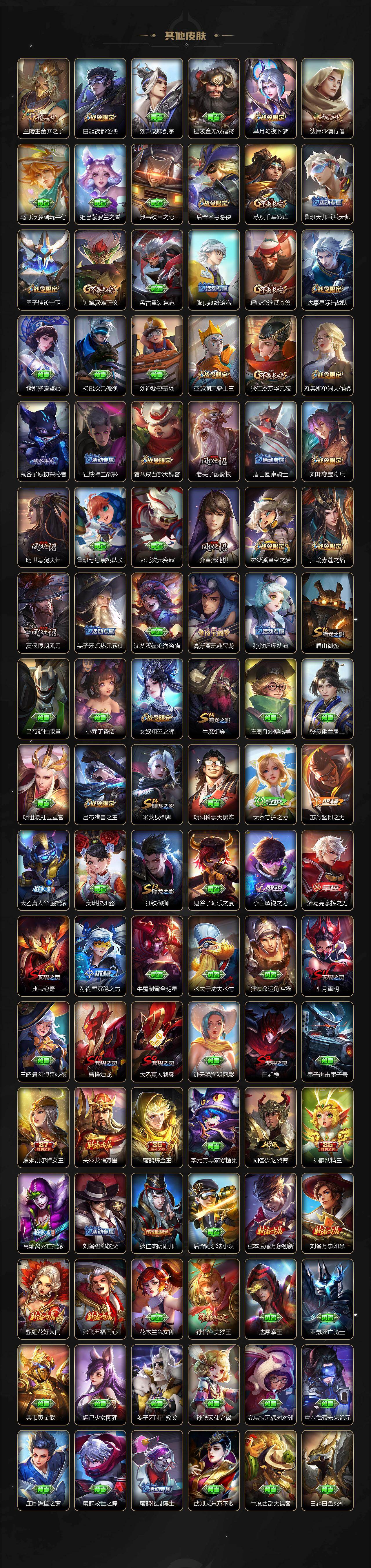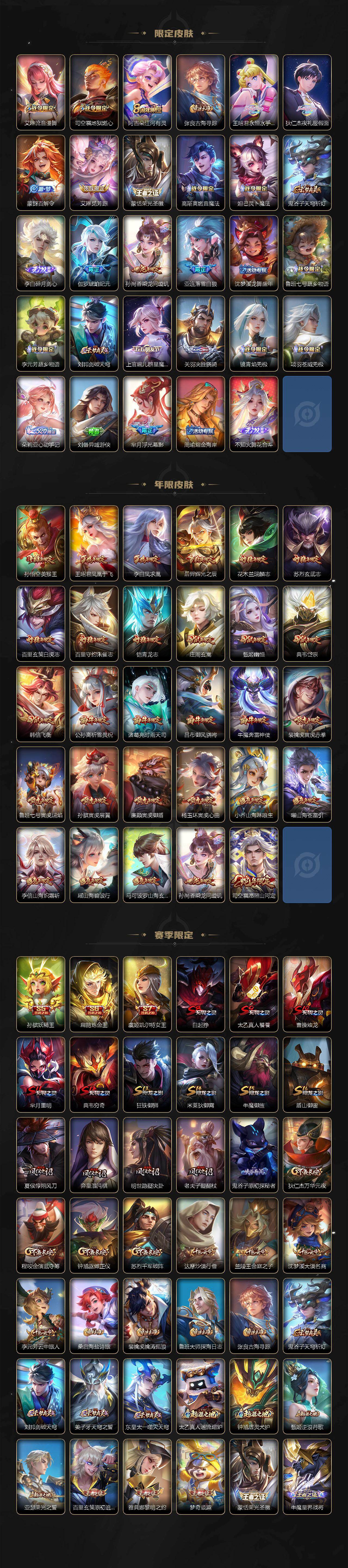 关羽冰锋战神,裴擒虎李小龙,牛魔奔雷神使,貂蝉逐梦之音,公孙离祈雪灵祝,吕布御风骁将,诸葛亮时雨天司,赵云龙胆,关羽武圣,黄忠烈魂,张飞虎魄,马超神威,后羿辉光之辰,庄周玄嵩,典韦岱宗,甄姬幽恒,韩信飞衡,裴擒虎天狼狩猎者,孙膑天狼运算者,哪吒逐梦之翼,马可波罗逐梦之星,韩信逐梦之影,铠青龙志,百里玄策白虎志,花木兰瑞麟志,苏烈玄武志,百里守约朱雀志,王昭君凤凰于飞,项羽霸王别姬,虞姬霸王别姬,小乔纯白花嫁,周瑜真爱至上,孙悟空大圣娶亲,花木兰默契交锋,兰陵王默契交锋,后羿如梦令,孙悟空至尊宝,雅典娜神奇女侠,妲己热情桑巴,干将莫邪冰霜恋舞曲,花木兰青春决赛季,蔡文姬奇迹圣诞,妲己时之彼端,公孙离蜜橘之夏,安琪拉魔法小厨娘,赵云引擎之心,孙悟空美猴王,庄周云端筑梦师,鲁班七号乒乒小将,大乔白鹤梁神女,猪八戒猪悟能,廉颇寅虎·御盾,孙尚香异界灵契,孙悟空孙行者,甄姬女儿国国王,镜匿光追影者,韩信傲雪梅枪,鲁班七号寅虎·瑞焰,孙膑寅虎·展翼,杨玉环寅虎·心曲,裴擒虎寅虎·赤拳,云中君时之祈愿,瑶时之祈愿,女娲补天,赵云百木心枪,公孙离玉兔公主,露娜启示之音,夏侯惇匿光决锋者,后羿无尽星芒,马可波罗深海之息,金蝉唐三藏,娜可露露前尘镜,橘右京枫霜尽,鲁班大师匿光启智者,妲己时之奇旅,王昭君星穹之声,不知火舞绯月行,上官婉儿神器·万象笔,盾山梦圆繁星,墨子降魔,李白诗剑行,马可波罗山海·玄木吟,盘古冰霜神祇,瑶山海·碧波行,西施至美·乘鲤谣,甄姬至美·化雀舞,夏侯惇霜北刀,桑启鸣野蒿,艾琳陌上桑,王昭君映山客,司空震愿照·山河定