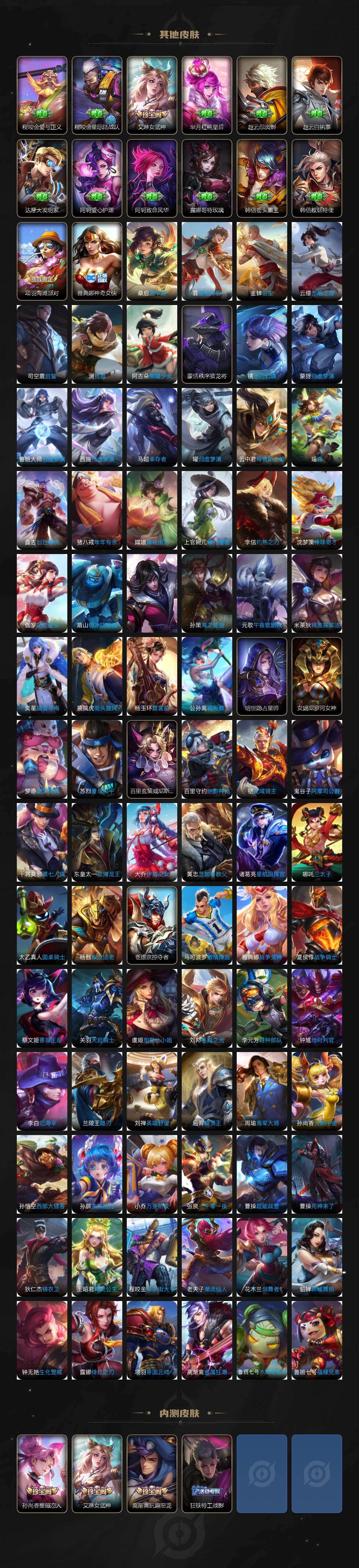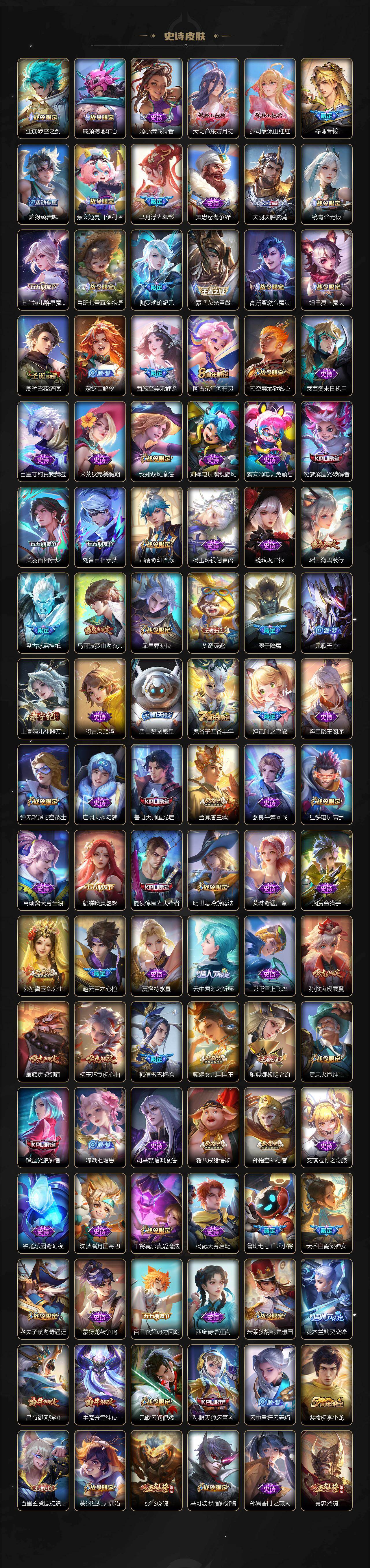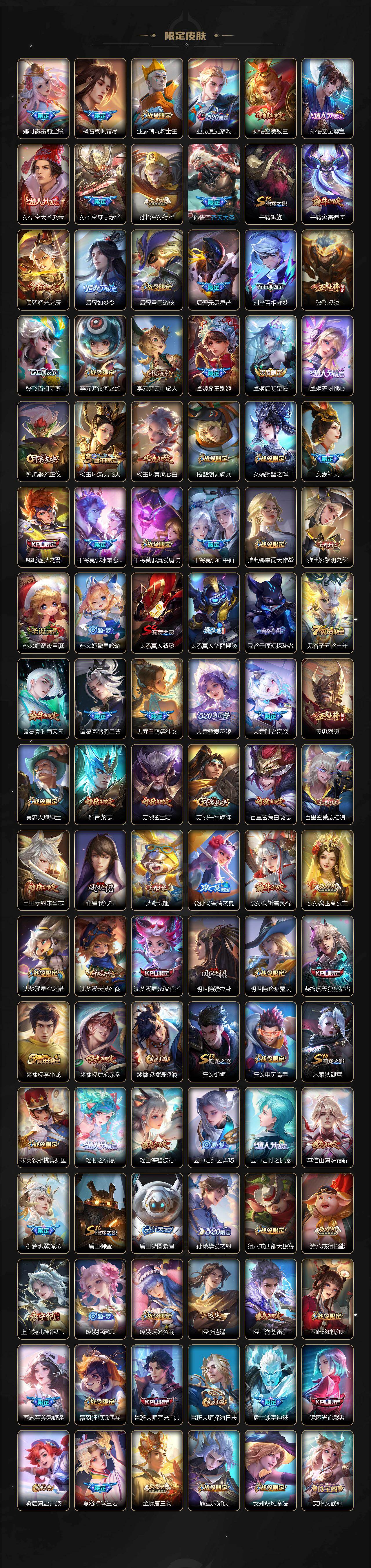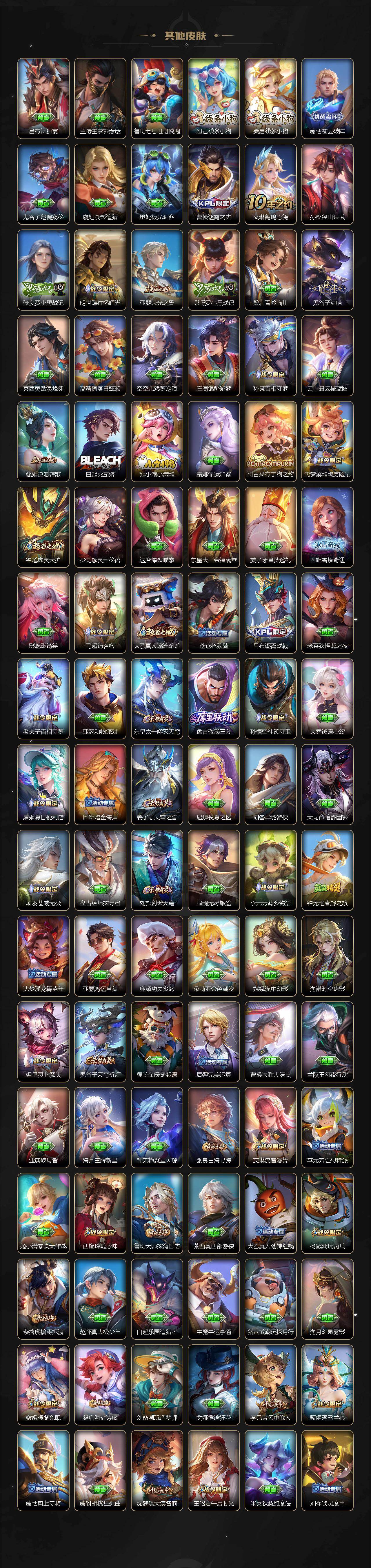 小乔青蛇,大乔白蛇,瑶遇见神鹿,娜可露露晚萤,伽罗箭羽风息,李元芳逐浪之夏,不知火舞魅语,公孙离无限星赏官,大乔猫狗日记,孙策猫狗日记,阿轲节奏热浪,露娜紫霞仙子,诸葛亮黄金分割率,王昭君偶像歌手,韩信白龙吟,项羽苍穹之光,孙尚香时之恋人,阿轲暗夜猫娘,雅典娜冰冠公主,吕布末日机甲,鲁班七号电玩小子,蒙犽龙鼓争鸣,橘右京修罗,墨子龙骑士,嬴政摇滚巨星,刘禅绅士熊喵,刘禅天才门将,白起星夜王子,安琪拉心灵骇客,安琪拉时之奇旅,程咬金功夫厨神,刘邦德古拉伯爵,兰陵王暗隐猎兽者,曹操幽灵船长,宫本武藏鬼剑武藏,司马懿暗渊魔法,亚瑟心灵战警,钟馗乐园奇幻夜,杨戬天秀·启明,蔡文姬舞动绿茵,廉颇地狱岩魂,西施诗语江南,小乔缤纷独角兽,夏侯惇乘风破浪,花木兰水晶猎龙者,铠曙光守护者,百里玄策热力回旋,墨子金属风暴,百里玄策原初追逐者,吕布圣诞狂欢,貂蝉圣诞恋歌,百里守约特工魅影,嬴政暗夜贵公子,嫦娥拒霜思,雅典娜黎明之约,李白千年之狐,哪吒雪上飞焰,夏洛特永昼,澜赏金猎手,艾琳奇遇舞章,貂蝉唤灵魅影,高渐离天秀·音浪,张良千筹问战,庄周天秀·幻梦,弈星滕王阁序,阿古朵顽趣,镜玫瑰异探,杨玉环银翎春语,刘备百相守梦,关羽百相守梦,沈梦溪匿光破解者,蔡文姬电玩·兔顽号,刘禅电玩·爆裂旋风,百里守约真我赫兹,莱西奥末日机甲,蒙犽百解令,周瑜雪夜绮愿,高渐离燃音魔法,伽罗琥珀纪元,上官婉儿群星魔术团,关羽决胜骁骑,李白谪仙醉月,姬小满飞车小橘子,苍狼魂孤将,狄仁杰绮世丹青