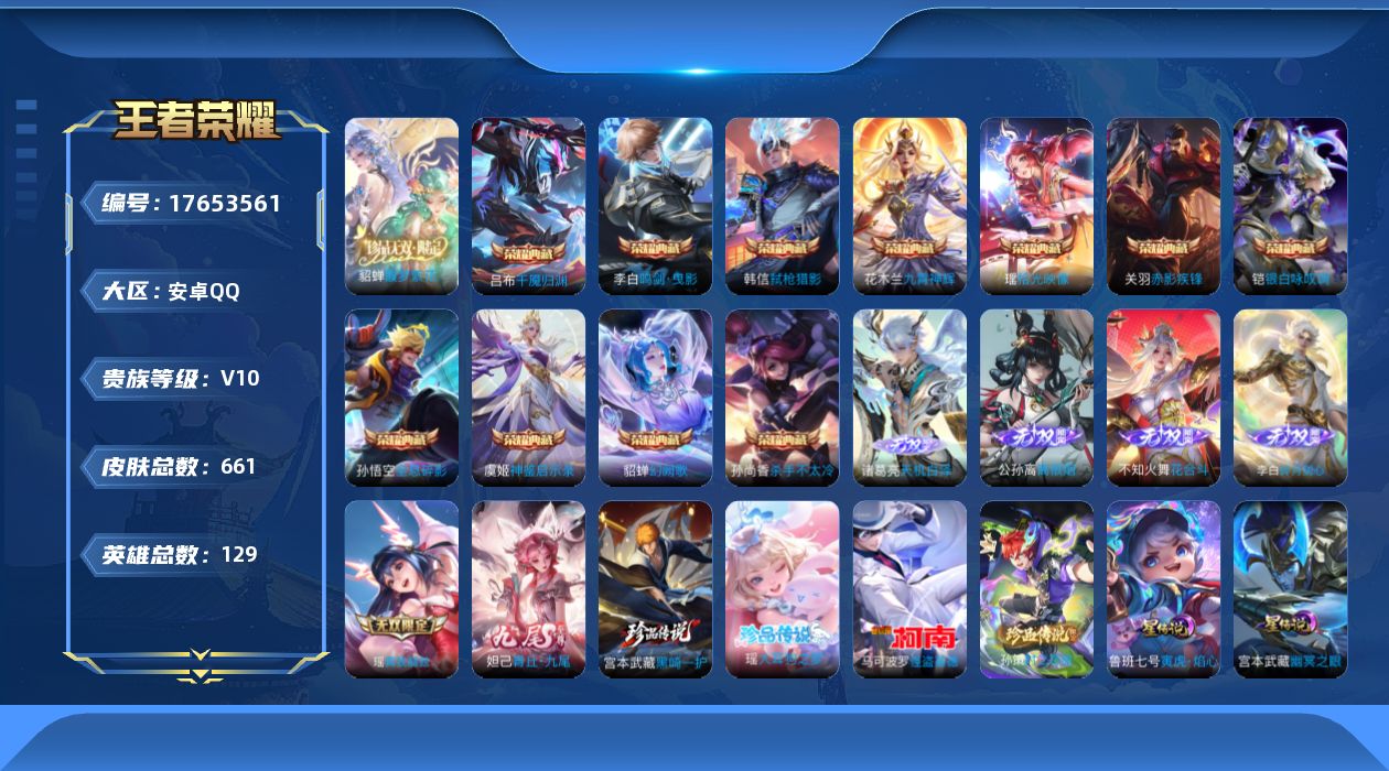 [17653561]可二次【特价出售/店主推荐/6市标/38段发育/32段打野】:安卓Q-V10-最强王者段位-129英雄-661皮肤-11典藏皮肤-1典藏英雄-1珍品无双-6无双-4珍品传说-14星元-104传说-233史诗 【英雄全皮】:墨子全皮,孙尚香全皮,刘禅全皮,高渐离全皮,钟无艳全皮,孙膑全皮,扁鹊全皮,周瑜全皮,李白全皮,马可波罗全皮,狄仁杰全皮,司马懿全皮,刘邦全皮,孙权全皮,花木兰全皮,艾琳全皮,不知火舞全皮,朵莉亚全皮,娜可露露全皮,橘右京全皮,牛魔全皮,苍全皮,太乙真人全皮,鬼谷子全皮,黄忠全皮,百里守约全皮,公孙离全皮,沈梦溪全皮,狂铁全皮,米莱狄全皮,瑶全皮,盾山全皮,猪八戒全皮,大司命全皮,敖隐全皮,西施全皮,蒙犽全皮,鲁班大师全皮,蒙恬全皮,阿古朵全皮,夏洛特全皮,司空震全皮,金蝉全皮,莱西奥全皮,空空儿全皮,影全皮,少司缘全皮 【荣耀典藏】:武则天英雄,孙悟空全息碎影,孙尚香杀手不太冷,李白鸣剑曳影,花木兰九霄神辉,关羽赤影疾锋,铠银白咏叹调,貂蝉幻阙歌,韩信弑枪猎影,虞姬神鉴启示录,瑶拾光映像,吕布千魇归渊 【珍品无双】:貂蝉馥梦繁花 【无双皮肤】:诸葛亮天机白泽,公孙离离恨烟,不知火舞花合斗,李白碎月剑心,瑶真我赫兹,妲己青丘九尾 【珍品传说】:宫本武藏黑崎一护,瑶大耳狗之梦,孙策时之奇旅,马可波罗怪盗基德 【传说皮肤】:朵莉亚神骥鸣幻洲,狄仁杰神骥赴朔漠,花木兰异界灵契,后羿神树通天,大司命死亡执政官,司马懿九山相柳,公孙离云诺千山,西施续相思,司空震愿照山河定,云缨幻光神枪,嬴政玄雷天君,王昭君映山客,桑启鸣野蒿,庄周牧神诗旅,夏侯惇霜北刀,铠冥王哈迪斯,朵莉亚心动手记,墨子黄金天蝎座,亚连落雪白狼,孙尚香乘龙问璇玑,艾琳觅芳踪,露娜霜月吟,孙膑小动物乐团,狄仁杰夜礼服假面,王昭君永恒水手月亮,甄姬至美化雀舞,大乔时之奇旅,鲁班七号时之奇旅,吕布遇见神鼓,马可波罗妄想实况,东皇太一灼幽烈阳,诸葛亮鹤羽星尊,澜电玩雷克斯,亚瑟追逃游戏,安琪拉追逃游戏,张飞百相守梦,公孙离记忆之芯,夏洛特浮生妄,干将莫邪画中仙,花木兰燃星之曲,虞姬无限倾心,项羽无限倾心,伽罗炽翼辉光,孙悟空齐天大圣,小乔山海琳琅生,曜山海苍雷引,李信山海炽霜斩,吕布怒海麟威,李白诗剑行,狄仁杰神器狴犴令,不知火舞绯月行,王昭君星穹之声,百里守约碎云,橘右京枫霜尽,娜可露露前尘镜,