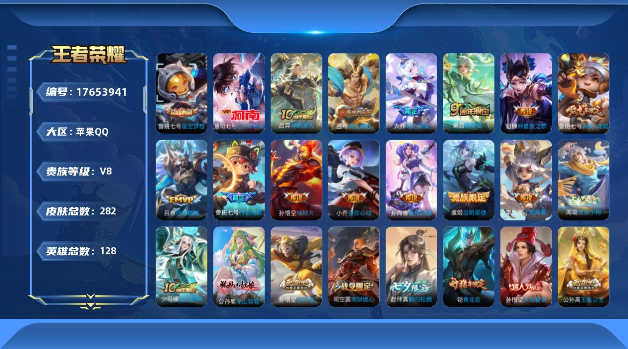 [17653941]可二次【特价出售/店主推荐】:苹果Q-V8-秩序白银II段位-128英雄-282皮肤-1典藏皮肤-1珍品传说-13传说-65史诗 【英雄全皮】:孙权全皮,敖隐全皮,戈娅全皮,影全皮 【荣耀典藏】:鲁班七号星空梦想 【珍品传说】:鲁班七号江户川柯南 【传说皮肤】:后羿神树通天,桑启鸣野蒿,大乔时之奇旅,鲁班七号时之奇旅,吕布遇见神鼓,吕布怒海麟威,孙尚香音你闪耀,鲁班七号寅虎瑞焰,小乔音你心动,李元芳飞鸢探春,虞姬启明星使,貂蝉仲夏夜之梦,孙悟空地狱火 【限定皮肤】:大乔绒语心约,狄仁杰阴阳师,赵云皇家上将,赵云百木心枪,嬴政优雅恋人,孙尚香蔷薇恋人,鲁班七号乒乒小将,鲁班七号寅虎瑞焰,鲁班七号时之奇旅,高渐离玩趣恶龙,芈月重明,芈月幻夜卜梦,吕布御风骁将,吕布遇见神鼓,甄姬游园惊梦,狄仁杰魔术师,狄仁杰万华元夜,达摩沙漠行僧,项羽海滩派对,老夫子醍醐杖,韩信傲雪梅枪,兰陵王金庭之子,孙悟空大圣娶亲,孙悟空孙行者,牛魔御旌,后羿圣弓游侠,李元芳匿光侦查者,李元芳云中旅人,虞姬启明星使,钟馗驱傩正仪,鬼谷子原初探秘者,大乔时之奇旅,黄忠火炮绅士,铠青龙志,苏烈千军破阵,公孙离玉兔公主,沈梦溪大漠名商,明世隐疑决卦,裴擒虎李小龙,裴擒虎擒涛扼浪,云中君纤云弄巧,云中君时之祈愿,盾山御銮,嫦娥拒霜思,嫦娥暖冬兔眠,西施玲珑珍味,鲁班大师探海日志,桑启海盐诗旅,暃星界游侠,戈娅驭风魔法,艾琳流音漫舞,赵怀真鹤归松栖,司空震地狱燃心,阿古朵江河有灵,张良古海寻踪,蒙犽百解令,妲己灵卜魔法,鬼谷子天穹祈灯,沈梦溪龙舞盛年,刘邦剑破天穹,刘备异域游侠 【年限皮肤】:铠青龙志,吕布御风骁将,鲁班七号寅虎瑞焰 【赛季限定】:芈月重明,牛魔御旌,盾山御銮,明世隐疑决卦,老夫子醍醐杖,鬼谷子原初探秘者,狄仁杰万华元夜,钟馗驱傩正仪,苏烈千军破阵,达摩沙漠行僧,兰陵王金庭之子,沈梦溪大漠名商,李元芳云中旅人,桑启海盐诗旅,裴擒虎擒涛扼浪,鲁班大师探海日志,张良古海寻踪,鬼谷子天穹祈灯,刘邦剑破天穹,东皇太一噬灭天穹 【战令限定】:后羿圣弓游侠,黄忠火炮绅士,芈月幻夜卜梦,暃星界游侠,嫦娥暖冬兔眠,戈娅驭风魔法,西施玲珑珍味,司空震地狱燃心,艾琳流音漫舞,妲己灵卜魔法,亚连破空之剑,孙悟空神迹守卫,百里守约百相守梦,老夫子百相守梦,周瑜线条小狗 【史诗皮肤】:周瑜线条小狗,少司缘巫礼祀神,公