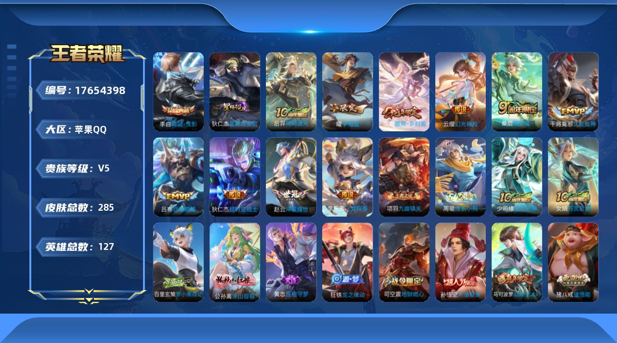 [17654398]【特价急出/详情看图】苹果Q-V5-至尊星耀I段位-127英雄-285皮肤-1典藏皮肤-1星元-10传说-77史诗