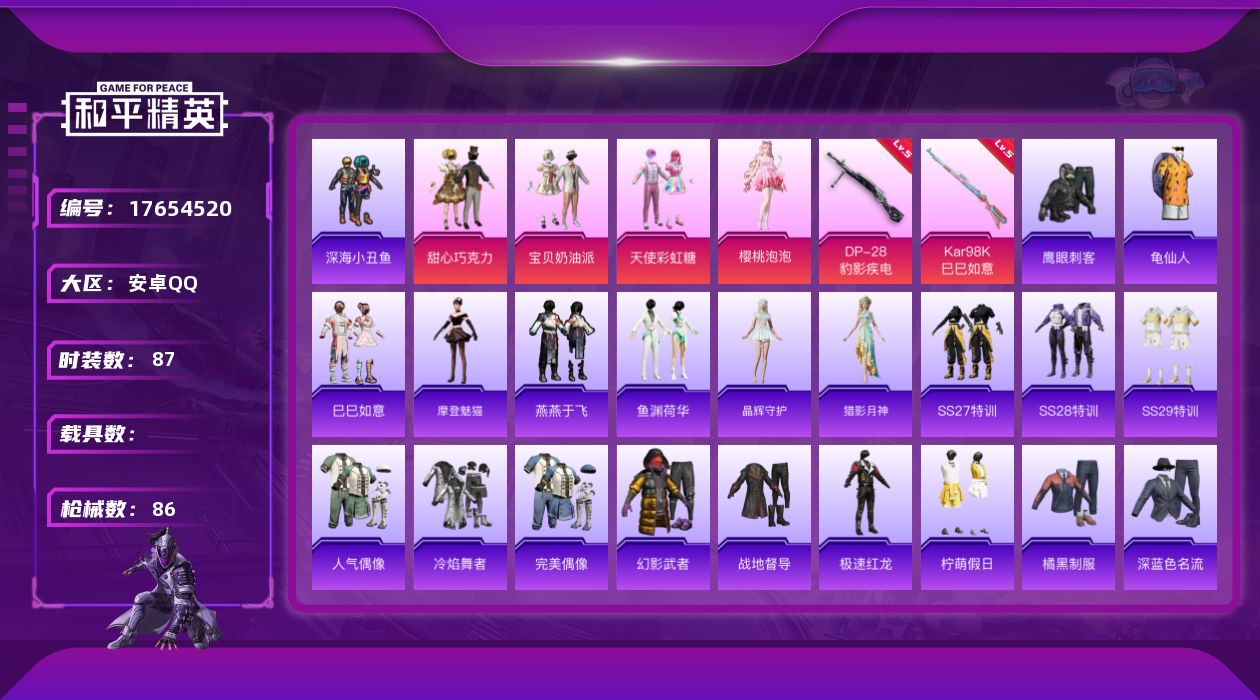 [17654520]【特价出售/店主推荐】安卓 手Q-4粉装-3特效枪-24949热力值-5王牌印记-87套装-86枪皮 【热门品类】:套装-深海小丑鱼,套装-龟仙人 【粉色套装】:粉装-甜心巧克力,粉装-宝贝奶油派,粉装-天使彩虹糖,角色-樱桃泡泡 【粉色枪皮等级】:Kar98K-巳巳如意(五级),Mk14-福马献瑞(五级),DP-28-豹影疾电(五级) 【粉色枪皮】:Kar98K-巳巳如意,Mk14-福马献瑞,DP-28-豹影疾电 【粉色降落伞】:甜心宝贝降落伞,暗夜鎏金降落伞,蜜语绒猫降落伞,精灵梦叶罗丽降落伞,千金淑猫降落伞 【稀有套装】:套装-龟仙人,套装-巳巳如意,套装-暖暖麦兜,套装-马上来财,角色-摩登魅猫,套装-燕燕于飞,套装-鱼渊荷华,套装-晶辉守护,角色-猎影月神,套装-雨过天青,套装-红釉青花 【稀有枪皮】:AKM-影袭,SCAR-L-炫彩节奏,GROZA-影袭,AUG-耀粉歌者,QBZ-彩虹符号,M762-天降萌叽,M762-彩虹符号,M762-甜心宝贝,AC-VAL-天降萌叽,AC-VAL-彩虹甜喵,UZI-啾咪啾咪,UZI-天降萌叽,UZI-影袭,汤姆逊-天降萌叽,汤姆逊-炫彩节奏,汤姆逊-像素花束,Kar98K-彩虹符号,M24-影袭,SKS-炫彩节奏,SKS-迅猛狂鲨,Mini14-耀粉歌者,莫辛纳甘-蜜语绒猫,S686-生命誓言,S686-雪月幻音,M249-绯穹魔姬,DP-28-彩虹符号,DP-28-甜心宝贝,MG3-幻世战舞者,蝎式手枪-千金淑猫,爆炸猎弓-喜羊羊与灰太狼 【其他套装】:套装-SS27特训,套装-SS28特训,套装-SS29特训,套装-人气偶像,套装-冷焰舞者,套装-完美偶像,套装-幻影武者,套装-战地督导,套装-极速红龙,套装-柠萌假日,套装-橘黑制服,套装-深蓝色名流,套装-湖蓝色名流,套装-灼焰舞者,套装-特殊使命,套装-特训学院,套装-猎鹰,套装-猛禽,套装-疯狂小兔子,套装-白熊同盟,套装-白色伏地魔,套装-破晓战魂,套装-破蛋小黄鸡,套装-竞技名士,套装-竞技达人朋克,套装-红色运动,套装-绮丽涂鸦,套装-缤纷果语,套装-耀粉歌者,套装-蓝彩潮人,套装-蓝色运动,套装-街头潮人,套装-都市魅力,套装-酒红色名流,套装-长空猛禽,套装-青年教官,套装-青玉碎影,套装-魅力单车,套装-鹤鸣,套装-黄色伏地魔,套装-黄色名