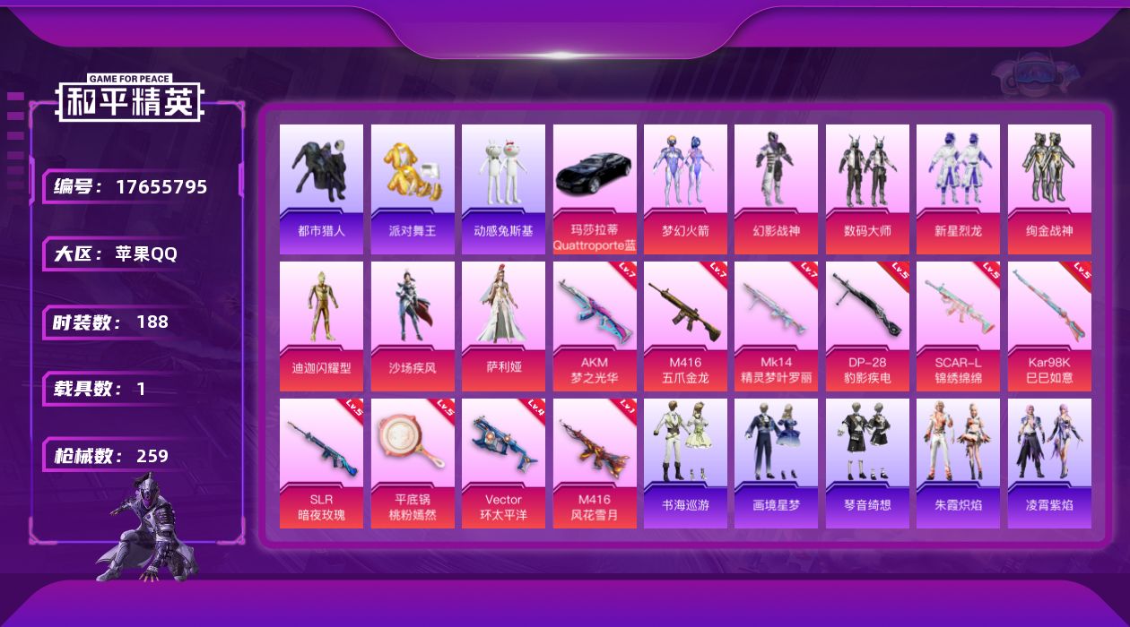[17655795]苹果 手Q-无敌战神框-8粉装-13特效枪-1载具-3粉色飞行器-81984热力值-20王牌印记-188套装-259枪皮 【热门品类】:粉装-梦幻火箭,套装-浪漫天命,套装-都市猎人,套装-派对舞王,角色-军刀雅典娜,套装-动感兔斯基人偶服,套装-龟仙人,套装-暗影哥特 【粉色套装】:粉装-幻影战神,粉装-数码大师,粉装-梦幻火箭,粉装-新星烈龙,粉装-绚金战神,角色-闪耀迪迦,粉装-沙场疾风,角色-萨利娅 【粉色枪皮等级】:AKM-梦之光华(七级),SCAR-L-锦绣绵绵(五级),M416-五爪金龙(七级),M416-风花雪月(一级),ACE32-萌骑漫游(二级),Vector-环太平洋(四级),AKS-74U-森灵之息(五级),Kar98K-巳巳如意(五级),Mk14-精灵梦叶罗丽(七级),Mk14-福马献瑞(一级),SLR-暗夜玫瑰(五级),DP-28-豹影疾电(五级),平底锅-桃粉嫣然(五级) 【粉色载具】:玛莎拉蒂Quattroporte(夜幕蓝) 【粉色枪皮】:AKM-梦之光华,SCAR-L-锦绣绵绵,M416-五爪金龙,M416-风花雪月,ACE32-萌骑漫游,Vector-环太平洋,AKS-74U-森灵之息,Kar98K-巳巳如意,Mk14-精灵梦叶罗丽,Mk14-福马献瑞,SLR-暗夜玫瑰,DP-28-豹影疾电,平底锅-桃粉嫣然 【粉色飞行器】:炫彩糖果飞行器,风花雪月飞行器,暮色之舞飞行器 【粉色降落伞】:极限特训降落伞,快乐主宰降落伞,幻影战神降落伞,百万伏特降落伞,梦幻火箭降落伞,星之彼岸降落伞,蓝莓炮弹降落伞,环太平洋降落伞,垂柳戏鸭降落伞,旋转彩虹降落伞,樱桃泡泡降落伞,荧海星豚降落伞,炫彩糖果降落伞,暮色玫影降落伞,辉光之愿降落伞 【稀有套装】:套装-龟仙人,套装-巳巳如意,套装-雪国风尚,套装-炫彩糖果,套装-马上有钱,套装-雏菊兔兔,套装-萝兰蝴蝶,套装-尼罗河传说,套装-火种守卫者,套装-糖糖葫芦,套装-青团波波,套装-燕燕于飞,套装-鱼渊荷华,套装-引力深渊,套装-朱霞炽焰,套装-凌霄紫焰,套装-擎苍青焰,套装-书海巡游,套装-画境星梦,套装-琴音绮想,套装-雨过天青,套装-红釉青花 【稀有枪皮】:AUG-冰晶雪宝,AKM-影袭,AKM-生命誓言,AKM-百万伏特,AKM-缤纷海域,AKM-虎虎生威,AKM-龙的传人,M16A