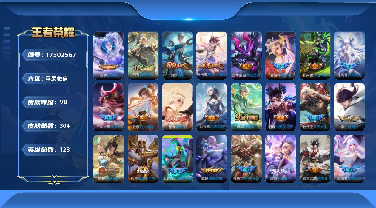 [17302567]苹果WX-V8-至尊星耀III段位-127英雄-296皮肤-1典藏皮肤-26传说-99史诗-3星传