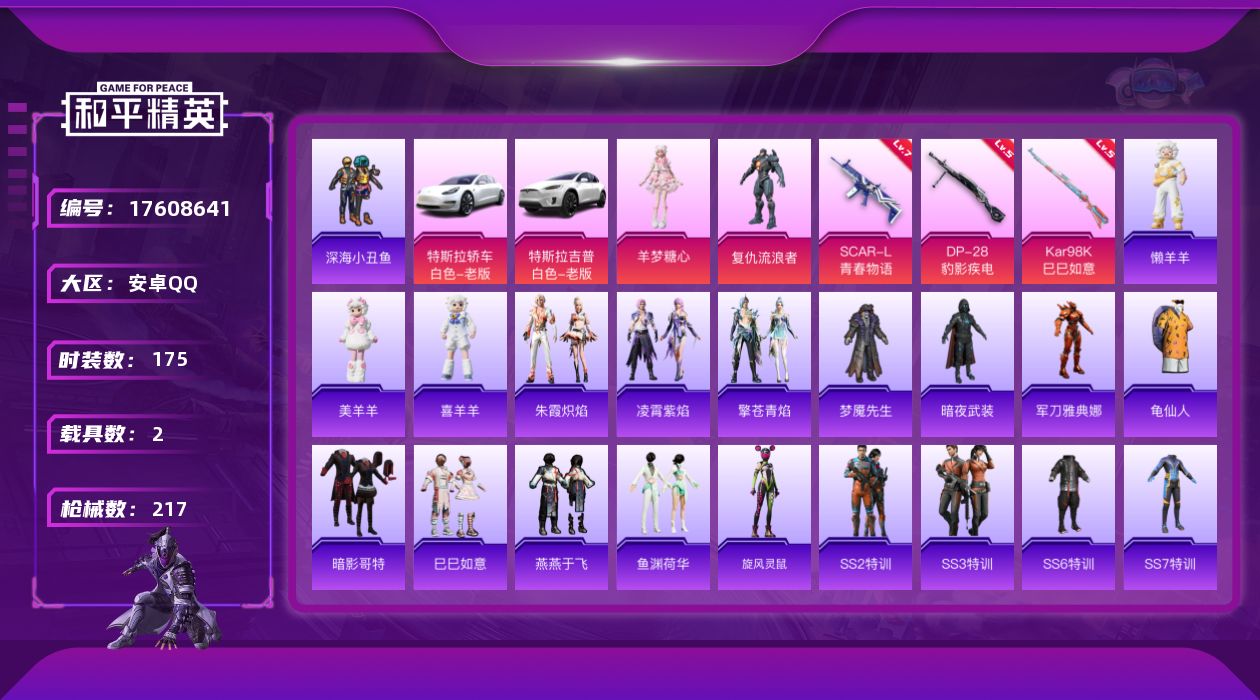 [17608641]【店主推荐捡漏号】安卓 手Q-2粉装-6特效枪-2载具-1粉色飞行器-68199热力值-13王牌印记-175套装-217枪皮【热门品类】:套装-深海小丑鱼,角色-军刀雅典娜,套装-龟仙人,套装-暗影哥特【粉色套装】:角色-复仇流浪者,角色-羊梦糖心【粉色枪皮等级】:SCAR-L-青春物语(七级),UMP45-萌骑冒险(三级),AKS-74U-森灵之息(五级),Kar98K-巳巳如意(五级),Mk14-福马献瑞(五级),DP-28-豹影疾电(五级)【粉色载具】:特斯拉Model 3(珍珠白),特斯拉Model X(珍珠白)【粉色枪皮】:SCAR-L-青春物语,UMP45-萌骑冒险,AKS-74U-森灵之息,Kar98K-巳巳如意,Mk14-福马献瑞,DP-28-豹影疾电