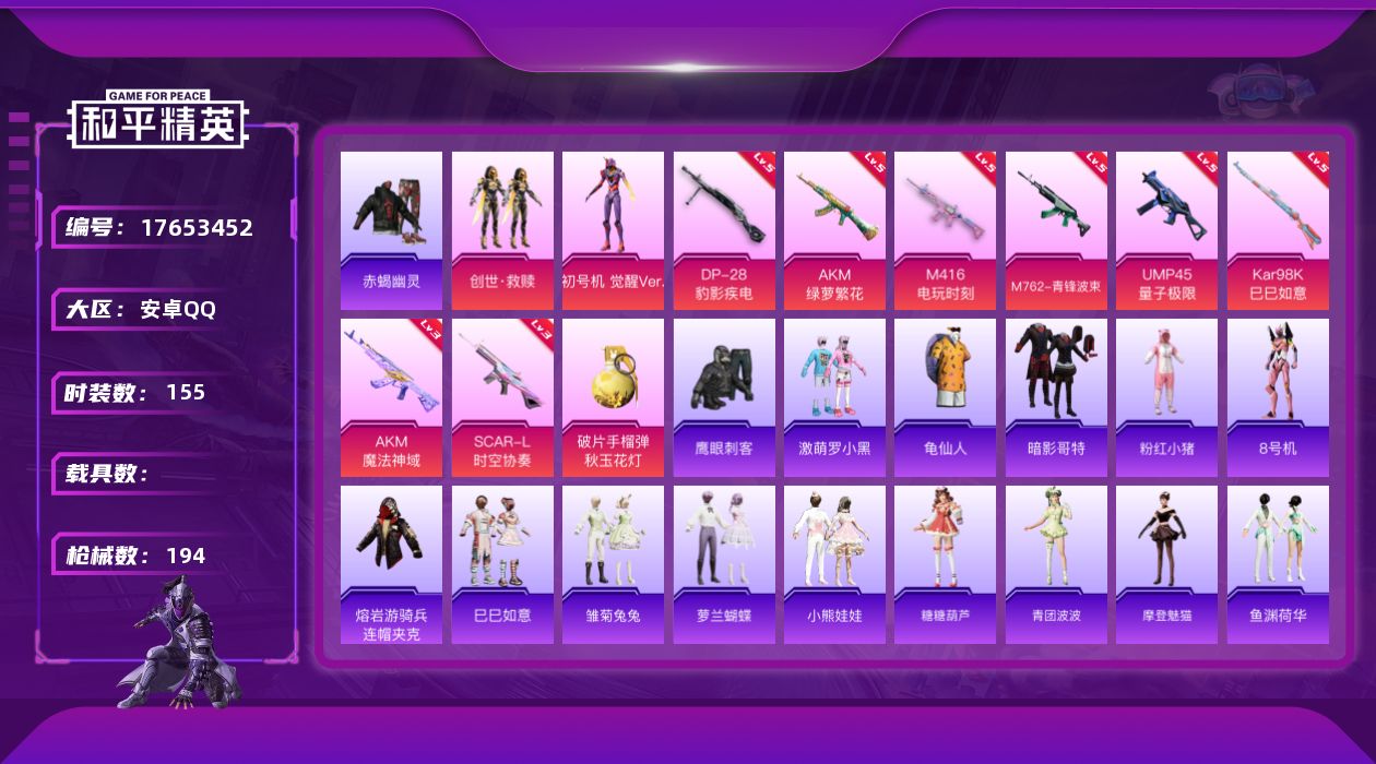 [17653452]安卓 手Q-2粉装-10特效枪-0载具-2粉色飞行器-61664热力值-11王牌印记-155套装-194枪皮