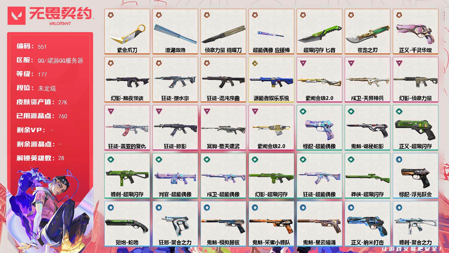 [17662584]【英雄】:幻棱,炼狱,维斯,暮蝶,钛狐,壹决,铁臂,捷风,雷兹,幽影,不死鸟,贤者,猎枭,蝰蛇,零,芮娜,奇乐,尚勃勒,霓虹,斯凯,夜露,星礈,K/O,海神,盖可,黑梦,钢锁 【近战武器】:近战武器-5周年//公测重制版 苍龙之刃,近战武器-侦察力量 蝴蝶刀,近战武器-紫金爪刀,近战武器-澄湖潋滟,近战武器-超能偶像 应援棒,近战武器-超限闪存 匕首 【狂徒】:狂徒-混沌序曲,狂徒-塑水宗,狂徒-掠影,狂徒-盖亚的复仇,狂徒-超能偶像 【幻影】:幻影-黯夜怪谈,幻影-源能者娱乐系统,幻影-侦察力量,幻影-超限闪存,幻影-聚合之力 【戍卫】:戍卫-天界神兵,戍卫-超能偶像,戍卫-浮光跃金 【獠犬】:獠犬-采蜜小蜂队,獠犬-模拟赫兹 【冥驹】:冥驹-堕天遗武,冥驹-模拟赫兹 【飞将】:飞将-聚合之力 【莽侠】:莽侠-超限闪存 【战神】:战神-采蜜小蜂队,战神-浮光跃金 【奥丁】:奥丁-紫阙金琅//2.0 【判官】:判官-超能偶像,判官-采蜜小蜂队 【雄鹿】:雄鹿-紫阙金琅//2.0,雄鹿-模拟赫兹 【骇灵】:骇灵-浮光跃金 【蜂刺】:蜂刺-超限闪存,蜂刺-聚合之力 【标配】:标配-超能偶像,标配-浮光跃金 【正义】:正义-千灵华绽,正义-超限闪存,正义-纳米打击 【鬼魅】:鬼魅-诡秘蛇影,鬼魅-采蜜小蜂队,鬼魅-模拟赫兹,鬼魅-星云暗涌 【狂怒】:狂怒-聚合之力 【短炮】:短炮-蛇吻 【卡面】:终章:激斗汉堡 卡面,进入射程 卡面,《双城之战》拥抱 卡面,精灵大战 卡面,欢迎来到底城 卡面,南瓜盛典 卡面,唱片的故事 卡面,钢弓与箭弦 卡面,排除故障 卡面,战术桌游 卡面,悠享食光 卡面,修车达人 卡面,热舞环节 卡面,模拟赫兹 卡面,浮光跃金 卡面,超限闪存 卡面,维斯工牌 卡面,正义的化身 卡面,至黑之夜 卡面,终章:生意人麦宝 卡面,铁之华 卡面,失而复得 卡面,时间到 卡面,最高舞台 卡面,复活专家 卡面,归乡 // 蝰蛇 卡面,超能偶像 卡面,生意人麦宝 卡面,音熊登场 卡面,声感陷阱设计图 卡面,红鳞松叶 卡面,钢锁工牌 卡面,战术小伙伴的夏日 卡面,采蜜小蜂队 卡面,聚合之力 卡面,梦幻奶茶 卡面,源能反应 卡面,零点嗅探设计图 卡面,无畏契约:蝰蛇 卡面,无畏契约GO!第一卷:芮娜 卡面,清除名单 卡面,无畏契约GO!第一卷:零 卡面,比比看谁快? 卡