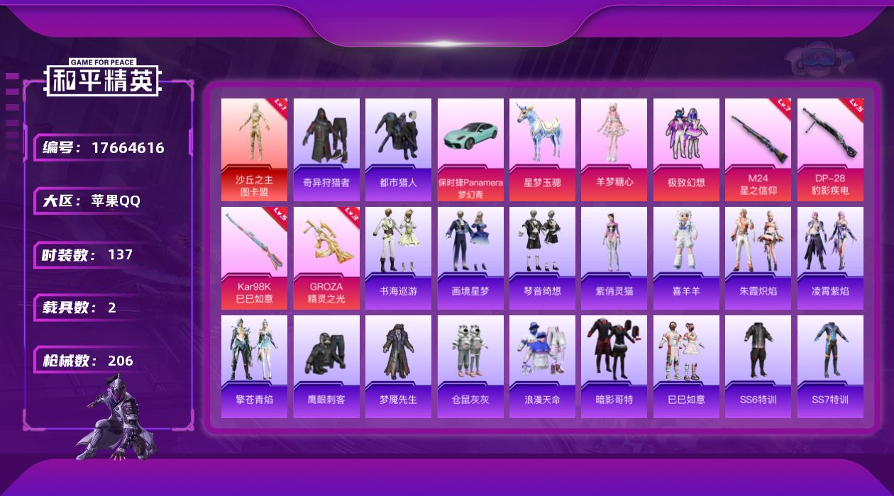 [17664616]【特价出售/店主推荐】苹果 手Q-1神装-2粉装-8特效枪-2载具-10粉色飞行器-65815热力值-3王牌印记-137套装-206枪皮 【红色神装等级】:沙丘之主-图卡盟(一级) 【红色角色神装】:沙丘之主-图卡盟 【热门品类】:套装-浪漫天命,套装-都市猎人,套装-奇异狩猎者,套装-暗影哥特 【粉色套装】:粉装-极致幻想,角色-羊梦糖心 【粉色枪皮等级】:SCAR-L-灵驹仙姬(三级),GROZA-精灵之光(三级),ACE32-萌骑漫游(一级),AKS-74U-森灵之息(五级),Kar98K-巳巳如意(五级),M24-星之信仰(七级),Mk14-福马献瑞(五级),DP-28-豹影疾电(五级) 【粉色载具】:保时捷Panamera(梦幻青),星梦玉骢 【粉色枪皮】:SCAR-L-灵驹仙姬,GROZA-精灵之光,ACE32-萌骑漫游,AKS-74U-森灵之息,Kar98K-巳巳如意,M24-星之信仰,Mk14-福马献瑞,DP-28-豹影疾电 【粉色飞行器】:香车宝马飞行器,炫彩糖果飞行器,精灵迷巫飞行器,沙丘之主天马,幻海精灵飞行器,曦光华影飞行器,终晖之翼飞行器,灵猫魔法师飞行器,灵珠游龙飞行器 【粉色降落伞】:百万伏特降落伞,未来战士降落伞,梦幻火箭降落伞,PEL轰鸣竞梦者降落伞,心之恋语降落伞,精灵之光降落伞,无垠阁降落伞,喜羊羊与灰太狼降落伞,魔童闹海 敖丙降落伞,异瞳寒姬降落伞,极意拳锋降落伞,炫彩糖果降落伞 【稀有套装】:套装-巳巳如意,套装-雪国风尚,套装-炫彩糖果,套装-马上来财,套装-朱霞炽焰,套装-凌霄紫焰,套装-擎苍青焰,玩偶服-喜羊羊,角色-紫俏灵猫,套装-书海巡游,套装-画境星梦,套装-琴音绮想,套装-雨过天青,套装-红釉青花 【稀有枪皮】:AUG-冰晶雪宝,AKM-夜灯,AKM-彩虹符号,AKM-影袭,AKM-星之信仰,AKM-灼热熔岩,AKM-生命誓言,AKM-霓虹街区,AKM-龙的传人,AKM-灵猫魔法师,M16A4-幻世战舞者,M16A4-生命誓言,M16A4-蓝色火焰,SCAR-L-夜灯,SCAR-L-未来战士,SCAR-L-炫彩节奏,SCAR-L-玉兔迎春,SCAR-L-生命誓言,SCAR-L-红色方程式,M416-夜灯,M416-神秘黑猫,M416-糯团青竹,M416-红色方程式,M416-蓝色火焰,M416-魔法学院,GR