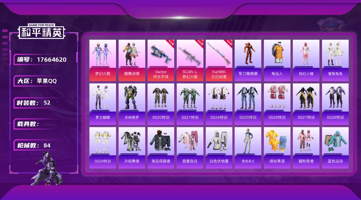 [17664620]苹果 手Q-2粉装-3特效枪-0载具-1粉色飞行器-25890热力值-1王牌印记-52套装-84枪皮 【热门品类】:粉装-梦幻火箭,角色-军刀雅典娜,套装-龟仙人,套装-粉红小猪 【粉色套装】:粉装-蝶舞迷情,粉装-梦幻火箭 【粉色枪皮等级】:SCAR-L-梦幻火箭(五级),Vector-环太平洋(六级),Kar98K-巳巳如意(二级) 【粉色枪皮】:SCAR-L-梦幻火箭,Vector-环太平洋,Kar98K-巳巳如意 【粉色飞行器】:梦幻火箭飞行器 【粉色降落伞】:梦幻火箭降落伞,环太平洋降落伞,莲影清波降落伞,圣堂之誓降落伞 【稀有套装】:套装-龟仙人,套装-雏菊兔兔,套装-萝兰蝴蝶,角色-多纳泰罗 【稀有枪皮】:AKM-环太平洋,M16A4-甜心亚梦,SCAR-L-玉兔迎春,M416-糯团青竹,M416-蓝色火焰,GROZA-异彩先驱,GROZA-懵萌河马,AUG-天降萌叽,AUG-耀粉歌者,AUG-青春冒险家,QBZ-原初圣火,QBZ-彩虹符号,M762-牛气冲天,M762-镭射皇者,G36C-懵萌河马,AC-VAL-天降萌叽,AC-VAL-快闪甜心,AC-VAL-甜心亚梦,蜜獾-天降萌叽,蜜獾-娇憨猪猪,UZI-天降萌叽,UZI-娇憨猪猪,UMP45-蓝色火焰,UMP45-绒宝小鹅,汤姆逊-环太平洋,汤姆逊-耀粉歌者,P90-快闪甜心,P90-飞驰魅影,Kar98K-梦幻火箭,AWM-圣堂之誓,Mini14-梦幻火箭,Mini14-炫彩节奏,Mk14-是爱神辣,SLR-娇憨猪猪,莫辛纳甘-懵萌河马,M417-惊鸿侠骨,MK20-H-快闪甜心,M200-惊鸿侠骨,S1897-炫彩节奏,S12K-娇憨猪猪,DBS-圣堂之誓,DBS-甜心亚梦,M249-彩虹符号,DP-28-原初圣火,DP-28-甜心亚梦,MG3-惊鸿侠骨,MG3-瑞龙福将,PKM-懵萌河马,P1911-粉锦千层,蝎式手枪-闲梦青缨,沙漠之鹰-快闪甜心,爆炸猎弓-惊鸿侠骨 【其他套装】:套装-SS20特训,套装-SS21特训,套装-SS24特训,套装-SS25特训,套装-SS26特训,套装-SS27特训,套装-SS28特训,套装-SS29特训,套装-冷焰舞者,套装-海岛探路者,套装-甜蜜告白,套装-白色伏地魔,套装-竞技名士,套装-粉红小猪,套装-缤纷果语,套装-耀粉歌者,套装-蓝色运动,套