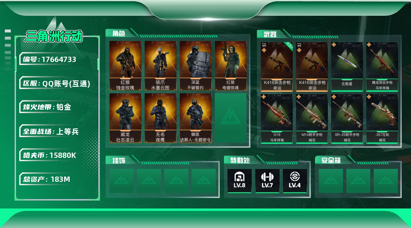 [17664733]【特价出售/店主推荐】183m总资产-15880k哈伏币-60烽火等级-铂金-50战场等级-上等兵 【干员外观】:红狼-蚀金玫瑰,骇爪-水墨云图,威龙-壮志凌云,蜂医-送葬人·无题密令,无名-夜鹰,深蓝-不破誓约,红狼-电锯惊魂 【近战皮肤】:近战-北极星,近战-黑鹰 【典藏外观】:K416突击步枪-命运 【典藏外观成色】:K416突击步枪-命运(优品A) 【传说外观】:M4A1突击步枪-蚀金玫瑰,M4A1突击步枪-阿瑞斯之怒,M4A1突击步枪-阿米娅,ASh-12战斗步枪-鹅鸭杀,AK-12突击步枪-夜鹰,AK-12突击步枪-特斯拉线圈,SCAR-H战斗步枪-铁艺苍穹,SCAR-H战斗步枪-水墨云图,SCAR-H战斗步枪-启航,G3战斗步枪-骑士,CAR-15突击步枪-黑鹰坠落,CAR-15突击步枪-阿米娅,腾龙突击步枪-捞点薯条,腾龙突击步枪-马年祥瑞,K437突击步枪-北极星,KC17突击步枪-电锯惊魂,Vector冲锋枪-阿瑞斯之怒,UZI冲锋枪-特斯拉线圈,SMG-45冲锋枪-骑士,SR-3M紧凑突击步枪-特斯拉线圈,勇士冲锋枪-能天使-午夜邮差,QCQ171冲锋枪-北极星,QCQ171冲锋枪-鹅鸭杀,725双管霰弹枪-送葬人-无题密令,PKM通用机枪-荼蘼,M250通用机枪-骑士之心,QJB201轻机枪-鹅鸭杀,M14射手步枪-缄花,SR-25射手步枪-缄花,AWM狙击步枪-捞点薯条,.357左轮-缄花,沙漠之鹰-阿瑞斯之怒,G18-马年祥瑞,93R-捞点薯条,复合弓-黑·天际线 【史诗外观】:M4A1突击步枪-特勤执行,AKM突击步枪-林中猎手,QBZ95-1突击步枪-曙光,QBZ95-1突击步枪-ACE,ASh-12战斗步枪-守夜人,ASh-12战斗步枪-无极限,K416突击步枪-阿萨拉特攻,M16A4突击步枪-竞赛选手,AUG突击步枪-战术迷彩,AUG突击步枪-蝮蛇,AUG突击步枪-特勤执行,M7战斗步枪-禁卫,SG552突击步枪-尖端治疗,SG552突击步枪-深海恐惧,SCAR-H战斗步枪-囚徒,G3战斗步枪-哈夫克警备,PTR-32突击步枪-ACE,PTR-32突击步枪-工业狂潮,AS Val突击步枪-尖端治疗,腾龙突击步枪-无垢,腾龙突击步枪-猎鳄行动,K437突击步枪-守护者,MP5冲锋枪-深海恐惧,MP5冲锋枪-战术竞备,MP5冲锋枪-