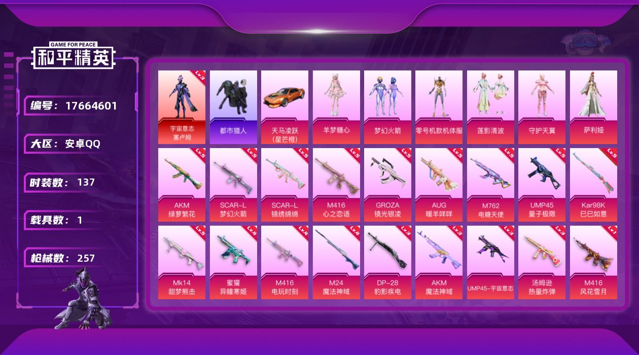 [17664601]【特价出售/店主推荐】安卓 手Q-1神装-6粉装-19特效枪-1载具-6粉色飞行器-78639热力值-13王牌印记-137套装-257枪皮