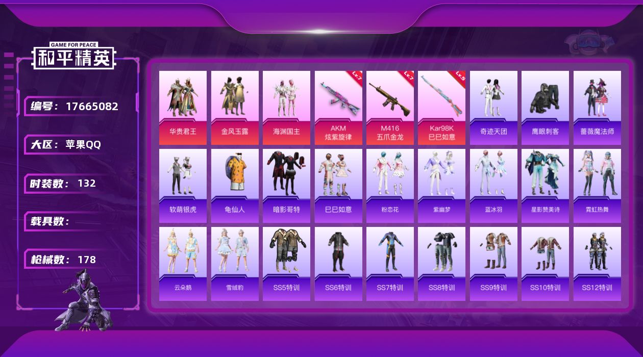 [17665082]苹果 手Q-4粉装-4特效枪-0载具-2粉色飞行器-57894热力值-3王牌印记-132套装-178枪皮 【热门品类】:套装-龟仙人,套装-暗影哥特 【粉色套装】:粉装-华贵君王,粉装-金风玉露,粉装-海渊国主,角色-虹云熊熊 【粉色枪皮等级】:AKM-炫紫旋律(七级),M416-五爪金龙(七级),Kar98K-巳巳如意(五级),Mk14-福马献瑞(五级) 【粉色枪皮】:AKM-炫紫旋律,M416-五爪金龙,Kar98K-巳巳如意,Mk14-福马献瑞 【粉色飞行器】:春暖花开飞行器,梦幻火箭飞行器 【粉色降落伞】:快乐主宰降落伞,百万伏特降落伞,春暖花开降落伞,精灵迷巫降落伞,梦幻火箭降落伞,华贵君王降落伞,金风玉露降落伞,PEL轰鸣竞梦者降落伞,神秘黑猫降落伞,四圣焕新降落伞,锦绣火鲤降落伞,霓虹漫游降落伞,精灵梦叶罗丽降落伞,星穹咏叹调降落伞,荧海星豚降落伞 【稀有套装】:套装-龟仙人,套装-巳巳如意,套装-马上有钱,套装-粉恋花,套装-紫幽梦,套装-蓝冰羽,套装-星影赞美诗,套装-霓虹热舞,套装-云朵鹅,套装-雪绒豹 【稀有枪皮】:AKM-春暖花开,AKM-灼热熔岩,AKM-破晓战魂,AKM-筑梦精灵,AKM-虎虎生威,AKM-霓虹街区,M16A4-幻世战舞者,M16A4-快乐主宰,M16A4-甜心亚梦,SCAR-L-炫彩节奏,SCAR-L-玉兔迎春,SCAR-L-红色方程式,M416-仓鼠灰灰,M416-夜灯,M416-神秘黑猫,M416-红色方程式,M416-蓝色火焰,GROZA-异彩先驱,GROZA-影袭,GROZA-春暖花开,GROZA-生命誓言,GROZA-黑色刀锋,AUG-幻影战神,AUG-耀粉歌者,AUG-魔法学院,QBZ-神秘黑猫,M762-乘风破浪,M762-奇异狩猎者,M762-快乐主宰,M762-拳皇97,M762-深海曼妙,M762-云朵鹅,G36C-金风玉露,AC-VAL-天降萌叽,AC-VAL-甜心亚梦,蜜獾-天降萌叽,蜜獾-御兔特攻,UZI-众神之王,UZI-啾咪啾咪,UZI-天降萌叽,UZI-红色方程式,UZI-金风玉露,UMP45-快乐主宰,UMP45-春暖花开,UMP45-生命誓言,Vector-焰鹰斗篷,Vector-黑色刀锋,Vector-龙虾霸霸,汤姆逊-勇闯险境,汤姆逊-奇异狩猎者,汤姆逊-异彩先驱,汤姆逊-炫彩节
