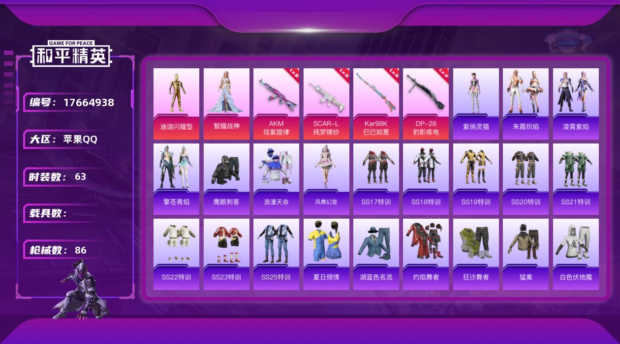 [17664938]精品金迪迦【特价出售/店主推荐】苹果 手Q-2粉装-5特效枪-27053热力值-9王牌印记-63套装-86枪皮【热门品类】:套装-浪漫天命【粉色套装】:角色-闪耀迪迦,角色-智耀战神【粉色枪皮等级】:AKM-炫紫旋律(六级),SCAR-L-纯梦嫁纱(五级),ACE32-萌骑漫游(一级),Kar98K-巳巳如意(四级),DP-28-豹影疾电(三级)