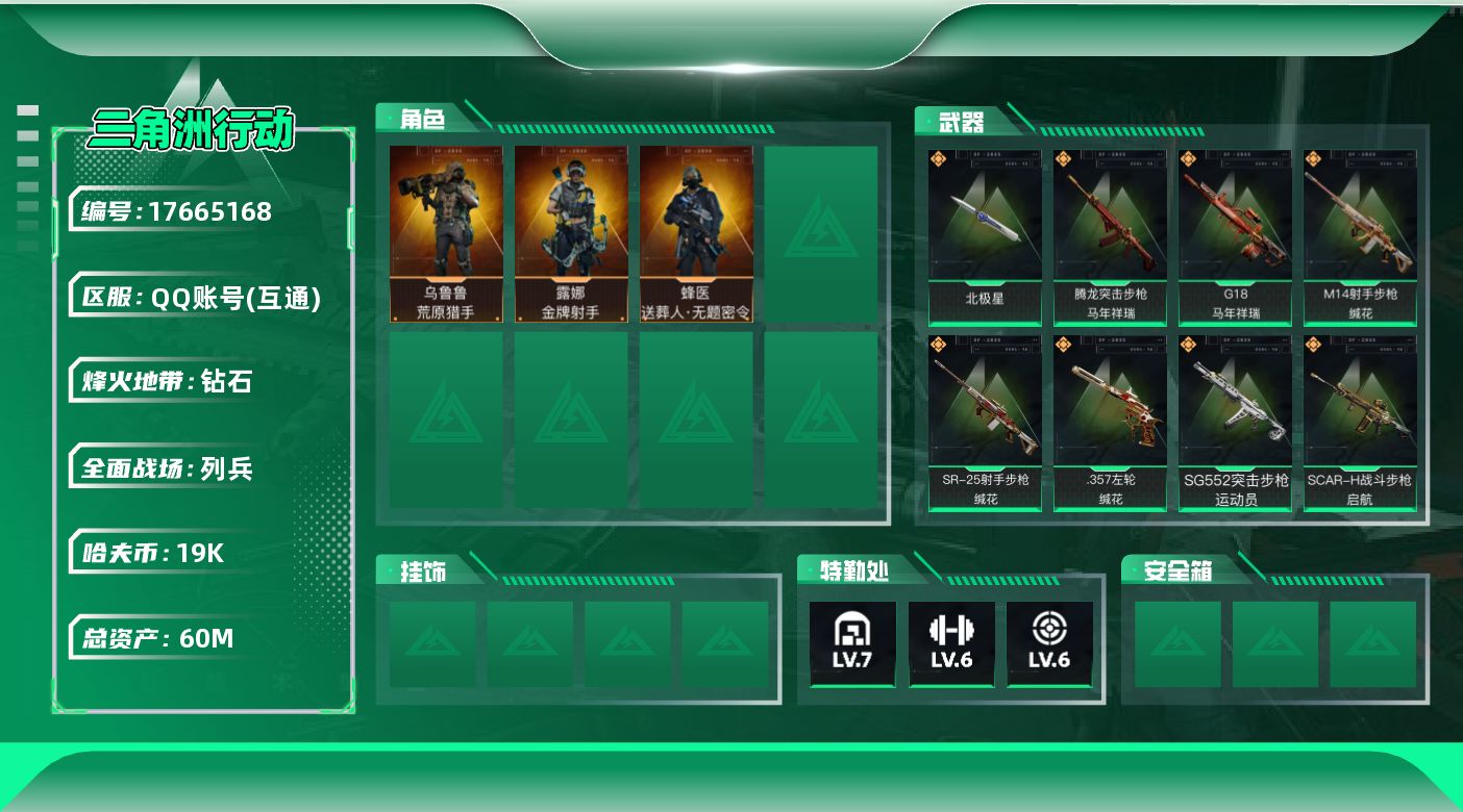 [17665168]60m总资产-19k哈伏币-60烽火等级-钻石-30战场等级-列兵 【干员外观】:蜂医-送葬人·无题密令,露娜-金牌射手,乌鲁鲁-荒原猎手 【近战皮肤】:近战-北极星,近战-黑鹰 【传说外观】:M4A1突击步枪-阿米娅,M16A4突击步枪-狩猎时刻,AUG突击步枪-悠然茶歇,M7战斗步枪-零度协议,SG552突击步枪-运动员,AK-12突击步枪-特斯拉线圈,SCAR-H战斗步枪-启航,G3战斗步枪-狩猎时刻,CAR-15突击步枪-阿米娅,腾龙突击步枪-马年祥瑞,K437突击步枪-北极星,MK47突击步枪-悠然茶歇,Vector冲锋枪-狩猎时刻,UZI冲锋枪-特斯拉线圈,UZI冲锋枪-悠然茶歇,SR-3M紧凑突击步枪-特斯拉线圈,勇士冲锋枪-能天使-午夜邮差,QCQ171冲锋枪-北极星,725双管霰弹枪-送葬人-无题密令,M14射手步枪-蛮荒,M14射手步枪-缄花,SR-25射手步枪-缄花,.357左轮-缄花,G18-马年祥瑞,复合弓-黑·天际线 【史诗外观】:AKM突击步枪-林中猎手,QBZ95-1突击步枪-曙光,K416突击步枪-冬日风情,K416突击步枪-腊梅,K416突击步枪-阿萨拉特攻,AUG突击步枪-蝮蛇,M7战斗步枪-百步穿杨,SG552突击步枪-深海恐惧,SCAR-H战斗步枪-囚徒,G3战斗步枪-流沙送葬,G3战斗步枪-哈夫克警备,AS Val突击步枪-百步穿杨,腾龙突击步枪-无垢,K437突击步枪-丛影谍踪,MP5冲锋枪-战术竞备,P90冲锋枪-紧急戒备,Vector冲锋枪-百步穿杨,Vector冲锋枪-异域战争,SMG-45冲锋枪-阿萨拉特攻,SR-3M紧凑突击步枪-荒野求生,SR-3M紧凑突击步枪-开工大吉,勇士冲锋枪-深海恐惧,勇士冲锋枪-丛影谍踪,MP7冲锋枪-无垢,MP7冲锋枪-六套之力,M1014霰弹枪-林中猎手,S12K霰弹枪-曙光,PKM通用机枪-蝮蛇,PKM通用机枪-荒野求生,PKM通用机枪-阿萨拉特攻,M249轻机枪-丛影谍踪,M250通用机枪-囚徒,QJB201轻机枪-炽焰,QJB201轻机枪-Old Habits,VSS射手步枪-丛影谍踪,SVD狙击步枪-荒野求生,M14射手步枪-工业狂潮, M14射手步枪-航天庆典,PSG-1射手步枪-无垢,SV-98狙击步枪-林中猎手,SV-98狙击步枪-囚徒,SV-98狙击步枪-猎鳄行