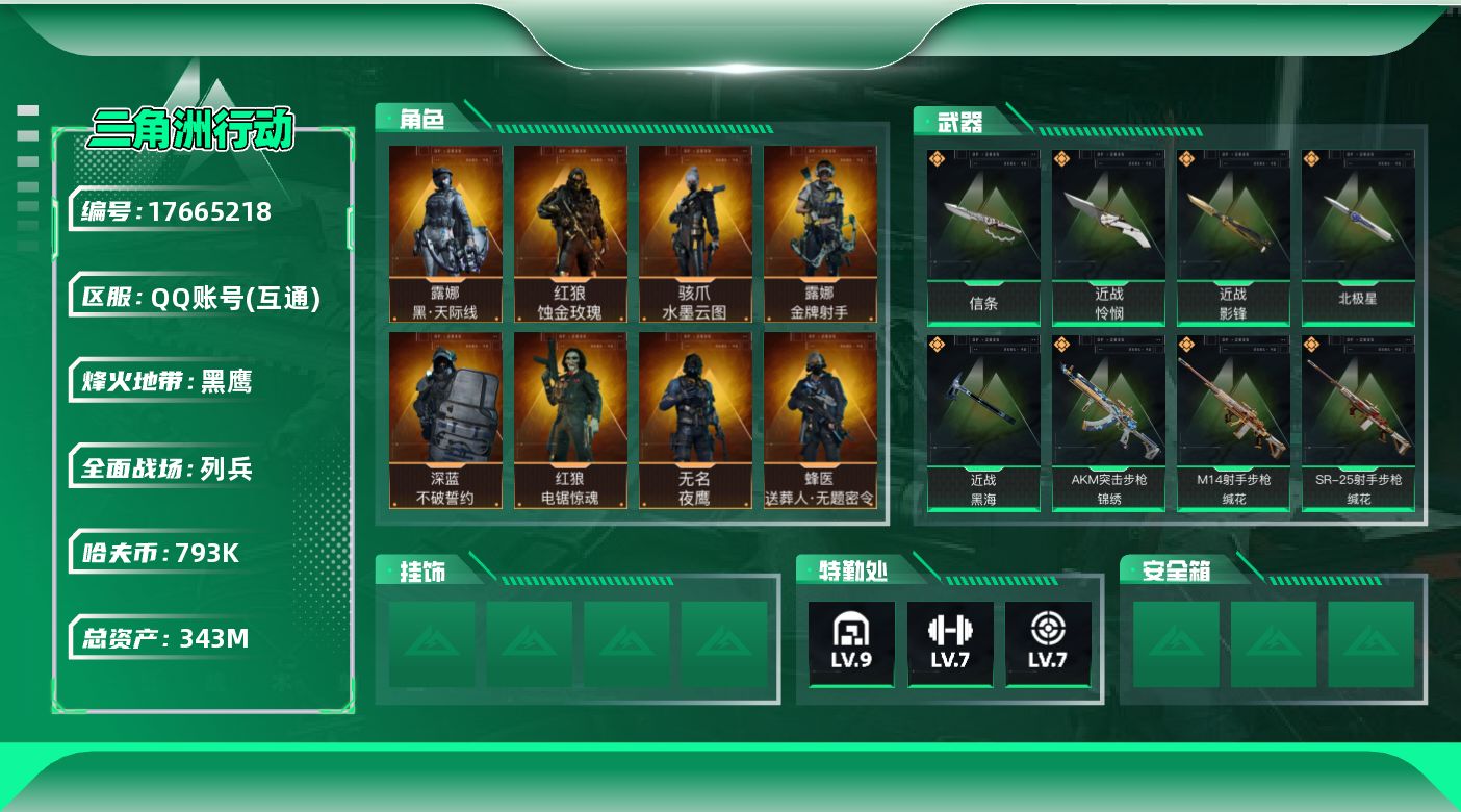 - [17522842]167m总资产-11809k哈伏币-60烽火等级-钻石-7战场等级-列兵 【近战皮肤】:近战-黑鹰 【传说外观】:M4A1突击步枪-阿米娅,AKM突击步枪-锦绣,QBZ95-1突击步枪-凌霄戍卫,SCAR-H战斗步枪-启航,腾龙突击步枪-捞点薯条,腾龙突击步枪-马年祥瑞,腾龙突击步枪-万金泪冠,K437突击步枪-锦绣,Vector冲锋枪-夜莺,SMG-45冲锋枪-锦绣,勇士冲锋枪-能天使-午夜邮差,勇士冲锋枪-万金泪冠,MK4冲锋枪-夜莺,M250通用机枪-骑士之心,Mini-14射手步枪-夜莺,SKS射手步枪-骑士,AWM狙击步枪-捞点薯条,AWM狙击步枪-万金泪冠,G18-马年祥瑞,93R-捞点薯条 【史诗外观】:AKM突击步枪-林中猎手,QBZ95-1突击步枪-曙光,ASh-12战斗步枪-无极限,M16A4突击步枪-竞赛选手,AUG突击步枪-蝮蛇,SCAR-H战斗步枪-囚徒,G3战斗步枪-哈夫克警备,K437突击步枪-守护者,MP5冲锋枪-战术竞备,MP5冲锋枪-竞技风,Vector冲锋枪-猎鳄行动,SR-3M紧凑突击步枪-战术竞备,勇士冲锋枪-工业狂潮,MP7冲锋枪-守护者,MP7冲锋枪-六套之力,M1014霰弹枪-林中猎手,S12K霰弹枪-曙光,PKM通用机枪-蝮蛇,QJB201轻机枪-炽焰,Mini-14射手步枪-守护者,SVD狙击步枪-暗夜猎手,SV-98狙击步枪-林中猎手,SV-98狙击步枪-囚徒,M700狙击步枪-竞技风,M700狙击步枪-蝮蛇,M700狙击步枪-哈夫克警备,AWM狙击步枪-无极限,复合弓-守护者 【稀有外观】:AKM突击步枪-战术演练,AKM突击步枪-肃杀,QBZ95-1突击步枪-公平竞技,K416突击步枪-一帆风顺,M7战斗步枪-捣蛋鬼,SG552突击步枪-2026,SG552突击步枪-贴花艺术,SCAR-H战斗步枪-荣耀列队,SCAR-H战斗步枪-黄昏,G3战斗步枪-战术演练,G3战斗步枪-主宰,PTR-32突击步枪-天网,PTR-32突击步枪-英雄,K437突击步枪-生存指令,MK47突击步枪-精英联盟,MP5冲锋枪-弄臣,MP5冲锋枪-哈夫克卫队,P90冲锋枪-浅鲨小队,P90冲锋枪-黄昏,P90冲锋枪-捣蛋鬼,SMG-45冲锋枪-哈夫克卫队,SMG-45冲锋枪-行动开启,SMG-45冲锋枪-幻影结构,勇士冲锋枪-冰天雪
