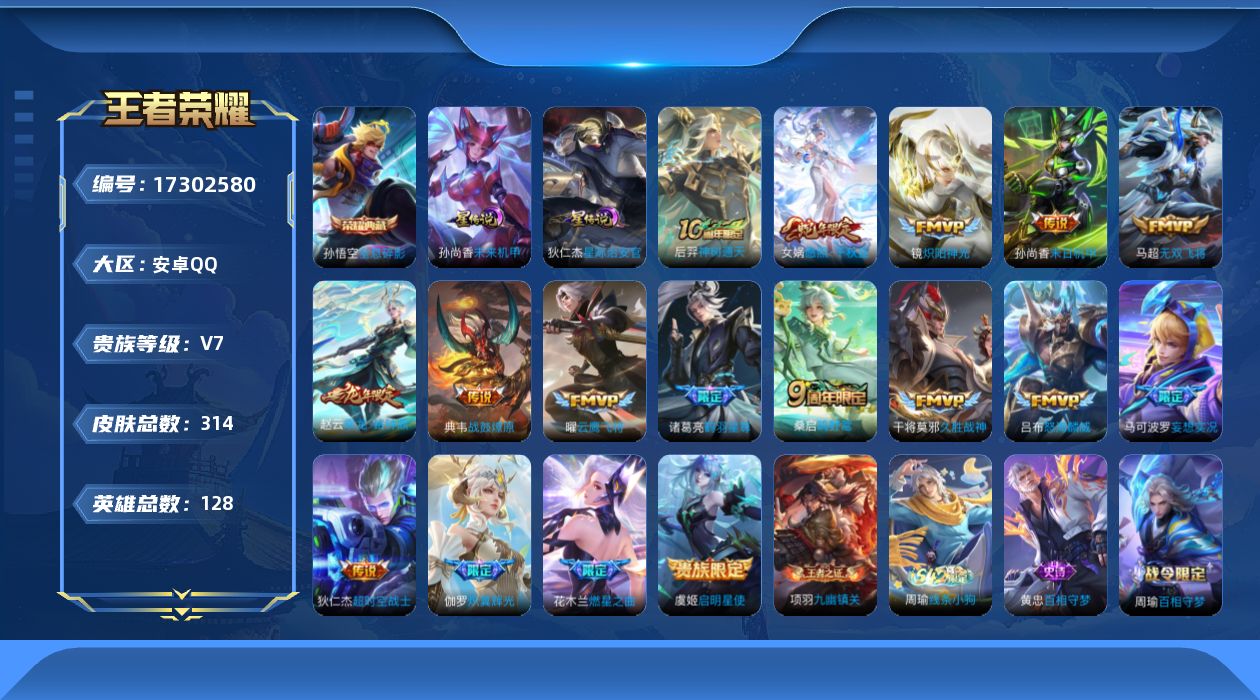 [17302580]【店主推荐捡漏号!可直接换绑】安卓Q-V8-永恒钻石I段位-128英雄-314皮肤-1典藏皮肤-17传说-78史诗-2星元 【英雄全皮】:孙权全皮,戈娅全皮,影全皮 【荣耀典藏】:孙悟空全息碎影 【传说皮肤】:后羿神树通天,女娲愿照千秋盛,桑启鸣野蒿,典韦战鼓燎原,赵云乘龙铭钟鼎,马可波罗妄想实况,诸葛亮鹤羽星尊,花木兰燃星之曲,伽罗炽翼辉光,吕布怒海麟威,马超无双飞将,镜炽阳神光,虞姬启明星使,曜云鹰飞将,干将莫邪久胜战神,孙尚香末日机甲,狄仁杰超时空战士 【限定皮肤】:白起狰,蔡文姬夏日便利店,大乔绒语心约,虞姬夏日便利店,姜子牙天穹之誓,狄仁杰阴阳师,赵云皇家上将,赵云引擎之心,嬴政白昼王子,孙尚香蔷薇恋人,庄周高山流水,高渐离玩趣恶龙,钟无艳超时空战士,扁鹊奇幻香踪,芈月重明,元歌云间偶戏,元歌无心,甄姬落雪兰心,典韦穷奇,马可波罗妄想实况,狄仁杰魔术师,达摩沙漠行僧,项羽海滩派对,程咬金演武夺筹,韩信傲雪梅枪,王昭君午后时光,兰陵王金庭之子,花木兰燃星之曲,孙悟空美猴王,李元芳云中旅人,虞姬启明星使,钟馗驱傩正仪,杨玉环遇见飞天,杨戬潮玩骑兵,太乙真人饕餮,鬼谷子五谷丰年,诸葛亮鹤羽星尊,苏烈千军破阵,沈梦溪大漠名商,沈梦溪匿光破解者,裴擒虎李小龙,裴擒虎擒涛扼浪,狂铁电玩高手,米莱狄御霄,云中君纤云弄巧,伽罗炽翼辉光,嫦娥拒霜思,嫦娥暖冬兔眠,西施玲珑珍味,鲁班大师探海日志,桑启海盐诗旅,暃星界游侠,戈娅驭风魔法,艾琳流音漫舞,司空震地狱燃心,阿古朵江河有灵,张良古海寻踪,蒙犽百解令,蒙恬荣光圣徽,高渐离燃音魔法,妲己灵卜魔法,鬼谷子天穹祈灯,赵云乘龙铭钟鼎,刘邦剑破天穹,上官婉儿群星魔术团,程咬金群星魔术团,周瑜熔金海岸 【年限皮肤】:孙悟空美猴王,伽罗炽翼辉光,赵云乘龙铭钟鼎 【赛季限定】:白起狰,芈月重明,典韦穷奇,达摩沙漠行僧,程咬金演武夺筹,兰陵王金庭之子,张良古海寻踪,李元芳云中旅人,钟馗驱傩正仪,太乙真人饕餮,苏烈千军破阵,沈梦溪大漠名商,裴擒虎擒涛扼浪,米莱狄御霄,鲁班大师探海日志,桑启海盐诗旅,鬼谷子天穹祈灯,蒙恬荣光圣徽,刘邦剑破天穹,姜子牙天穹之誓 【战令限定】:蔡文姬夏日便利店,虞姬夏日便利店,嬴政白昼王子,钟无艳超时空战士,扁鹊奇幻香踪,元歌云间偶戏,甄姬落雪兰心,王昭君午后时光,艾琳流音漫舞,杨戬潮玩骑兵,狂铁电玩高手,嫦娥