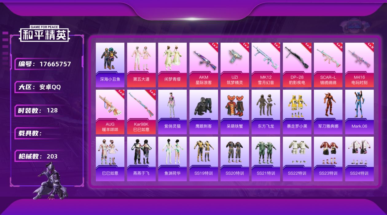[17665757]【店主推荐捡漏号!可直接换绑】安卓 手Q-2粉装-10特效枪-0载具-1粉色飞行器-61055热力值-16王牌印记-128套装-203枪皮【热门品类】:套装-深海小丑鱼,角色-军刀雅典娜,角色-Mark.06【粉色套装】:粉装-第五大道,粉装-闲梦青缨【粉色枪皮等级】:AKM-星际浪客(七级),SCAR-L-锦绣绵绵(五级),M416-电玩时刻(五级),AUG-暖羊咩咩(五级),UZI-筑梦精灵(七级),UMP45-萌骑冒险(五级),Kar98K-巳巳如意(五级),Mk14-福马献瑞(五级),MK12-雪月幻音(七级),DP-28-豹影疾电(五级)【粉色枪皮】:AKM-星际浪客,SCAR-L-锦绣绵绵,M416-电玩时刻,AUG-暖羊咩咩,UZI-筑梦精灵,UMP45-萌骑冒险,Kar98K-巳巳如意,Mk14-福马献瑞,MK12-雪月幻音,DP-28-豹影疾电【粉色飞行器】:炫彩糖果飞行器