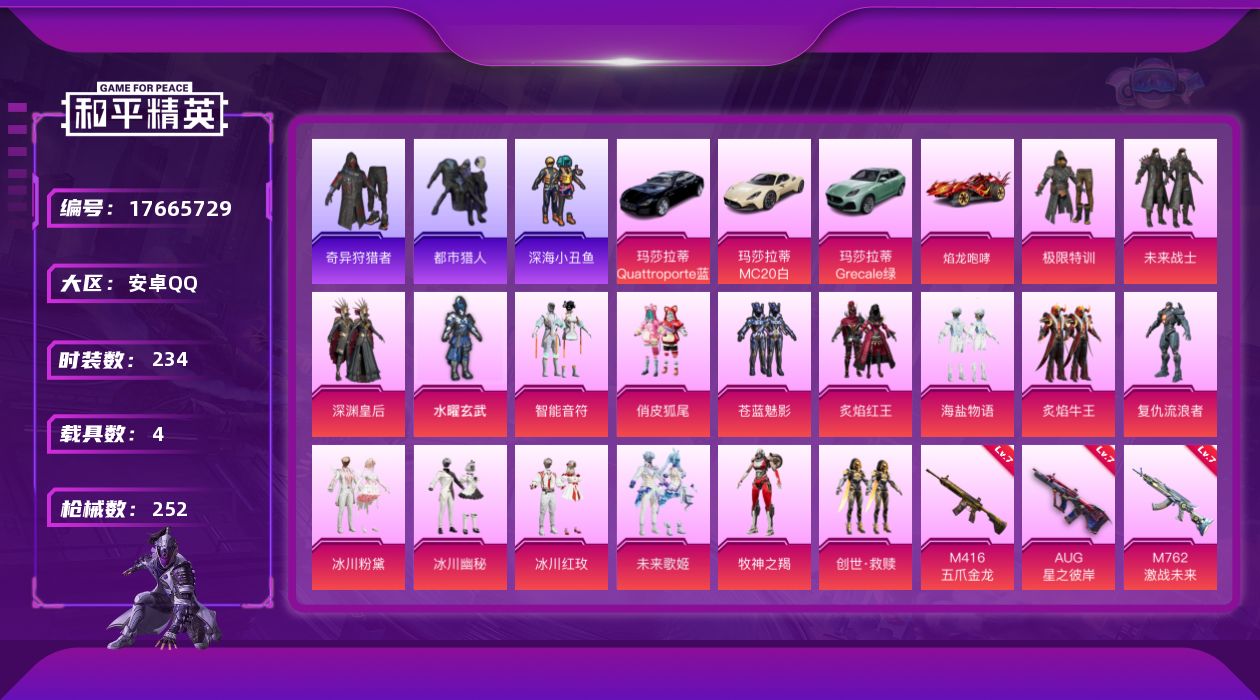 [17665729]【特价出售/店主推荐】安卓 手Q-17粉装-10特效枪-4载具-2粉色飞行器-95257热力值-15王牌印记-234套装-252枪皮【热门品类】:套装-浪漫天命,套装-都市猎人,套装-深海小丑鱼,套装-小丑鱼,套装-奇异狩猎者,角色-军刀雅典娜,套装-金羽特工,套装-忍者信条,套装-龟仙人,套装-暗影哥特【粉色套装】:粉装-极限特训,粉装-未来战士,粉装-深渊皇后,粉装-水曜玄武,粉装-智能音符,粉装-俏皮狐尾,粉装-苍蓝魅影,粉装-炙焰红王,粉装-海盐物语,粉装-炙焰牛王,角色-复仇流浪者,粉装-冰川粉黛,粉装-冰川幽秘,粉装-冰川红玫,粉装-未来歌姬,粉装-牧神之羯,套装-创世·救赎【粉色枪皮等级】:AKM-绿萝繁花(五级),SCAR-L-锦绣绵绵(五级),M416-五爪金龙(七级),M416-电玩时刻(五级),AUG-星之彼岸(七级),M762-激战未来(七级),UMP45-萌骑冒险(四级),Kar98K-巳巳如意(五级),DP-28-豹影疾电(五级),MG3-梦幻舞会(七级)【粉色载具】:玛莎拉蒂MC20(星石白),玛莎拉蒂Quattroporte(夜幕蓝),玛莎拉蒂Grecale(薄荷绿),焰龙咆哮【粉色枪皮】:AKM-绿萝繁花,SCAR-L-锦绣绵绵,M416-五爪金龙,M416-电玩时刻,AUG-星之彼岸,M762-激战未来,UMP45-萌骑冒险,Kar98K-巳巳如意,DP-28-豹影疾电,MG3-梦幻舞会【粉色飞行器】:梦幻火箭飞行器,超新星飞行器