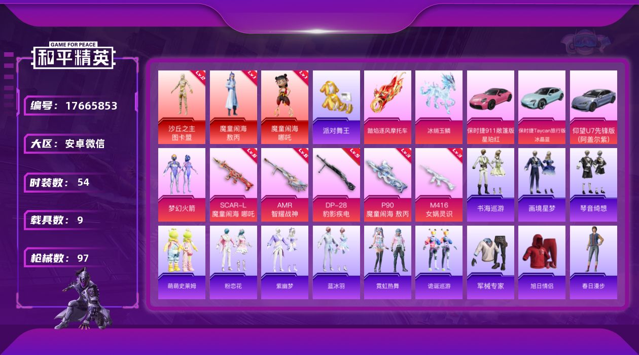 [17665853]【店主推荐捡漏号!可直接换绑】安卓 微信-4神装-2粉装-8特效枪-9载具-6粉色飞行器-47953热力值-6王牌印记-54套装-97枪皮【红色载具】:法拉利Roma(假日梦)(一级)【红色神装等级】:霜月狼主-尼诺(一级),魔童闹海-敖丙(一级),魔童闹海-哪吒(一级),沙丘之主-图卡盟(二级)【红色角色神装】:霜月狼主-尼诺,魔童闹海-敖丙,魔童闹海-哪吒,沙丘之主-图卡盟【热门品类】:粉装-梦幻火箭,套装-派对舞王【粉色套装】:粉装-梦幻火箭,角色-罪夜之冕【粉色枪皮等级】:AKM-暮色玫影(三级),SCAR-L-魔童闹海 哪吒(六级),M416-女娲灵识(三级),P90-魔童闹海 敖丙(三级),Mk14-福马献瑞(五级),AMR-智耀战神(六级),DP-28-豹影疾电(五级),燃烧瓶-天降桃花(六级)【粉色载具】:法拉利Roma(假日梦),法拉利Purosangue(纽博格林银),仰望U7(阿盖尔紫),保时捷911 敞篷版(星珀红),保时捷Taycan 旅行版(冰晶蓝),踏焰逐风摩托车,僚机-冰龙团团,冰绡玉鳞,霜月冰狼【粉色枪皮】:AKM-暮色玫影,SCAR-L-魔童闹海 哪吒,M416-女娲灵识,P90-魔童闹海 敖丙,Mk14-福马献瑞,AMR-智耀战神,DP-28-豹影疾电,燃烧瓶-天降桃花【粉色飞行器】:香车宝马飞行器,沙丘之主天马,飞天猪飞行器,灵珠游龙飞行器,云梦轻舟飞行器,冰狼掠影飞行器
