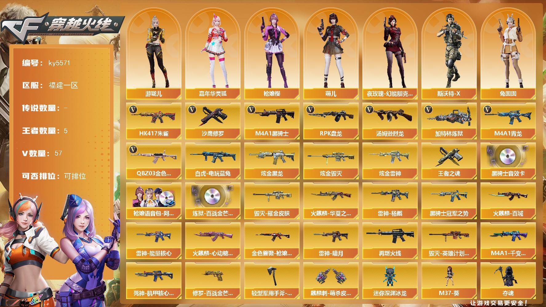 [17666115]【ky5571】福建一区-63V-5王者武器数-3炫金武器数 【热门武器】:QBZ03-金色蔷薇,HK417-朱雀,M4A1-青龙,白虎-电玩蓝兔,M4A1-黑骑士,汤姆逊-烈龙*5,RPK-盘龙*4,加特林-炼狱,沙鹰-修罗*4 【王者炫金武器】:王者之魂,炫金黑龙,炫金雷神,炫金毁灭 【音效卡】:M4A1-黑骑士音效卡,枪娘语音包-阿敏,炼狱-百战金芒-庆典舞曲音效卡 【皮肤】:金色蔷薇-枪娘阿敏 皮肤*2,雷神-暗月,雷神-能量核心,雷神-杨戬,M4A1-再燃火线,火麒麟-华夏之心,火麒麟-百城,火麒麟-心动糖果,毁灭耀金皮肤,毁灭-英雄计划 皮肤,M4A1-千变-孔明皮肤,黑骑士-冠军之势,死神-机甲核心皮肤,修罗-百战金芒 皮肤,轻型军用手斧-再燃火线,麒麟刺-萌杀皮肤 【角色】:葵,樱,枪娘樱,狐影,飞虎队-X,风暴女,嘉年华灵狐,麻雀,曼陀罗-X,萌儿,潘多拉-X,潘多拉-甜心教官,斯沃特-X,蜀雪,兔囡囡,新娜塔莎,雪莉杨-摸金校尉,夜玫瑰-幻能朋克,影武者-X,游珑儿 【人偶武器】:M37-葵,迷你深渊冰龙,夺魂,迷你牛牛,迷你生化手雷*2,深渊终结者手雷 【暴走生化】:超级对讲机 【挑战大师】:AK47-冰龙粉碎者,冰龙粉碎者-白马银枪,激光毁灭者III-白马银枪*2,激光毁灭者III,神圣爆裂者-末日III 【英雄级武器】:AK47-火麒麟*2,M4A1-黑龙,M4A1-雷神*2,M4A1-黑骑士,AK47-黑武士,AK12-天启,M4A1-青龙,HK417-朱雀,黑武士-锦绣游龙*2,M4A1-玫瑰精灵,QBZ03-金色蔷薇,白虎-电玩蓝兔,AWM-天龙,Barrett-毁灭,Barrett-极光,王者之怒-觉醒版,RPK-盘龙*4,加特林-炼狱,炼狱-百战金芒,汤姆逊-烈龙*5,烈龙-云海游龙,沙鹰-修罗*4,沙鹰-天神,屠龙*2,龙啸*2,擎天,麒麟刺,麒麟刺-百战金芒,高爆手雷-雷霆,高爆手雷-神工天巧,闪光弹-雷霆,闪光弹-神工天巧,烟雾弹-雷霆 【道具】:CFS限定背包,冰冰企鹅背包,次元之矛-背包,炫彩背包,百战金芒炫彩背包,裂空之翼背包-金色,女皇终结者-魔龙之吻,绿色巨人,灵魂忍者*3,变异宝贝,迷雾幽灵*2,夺命之镰,防化服*2,语音特效-盛典烟火,萌萌小葵表情,防弹头盔*2,防弹衣*2,C4工具钳*2,手雷包*2 【特殊