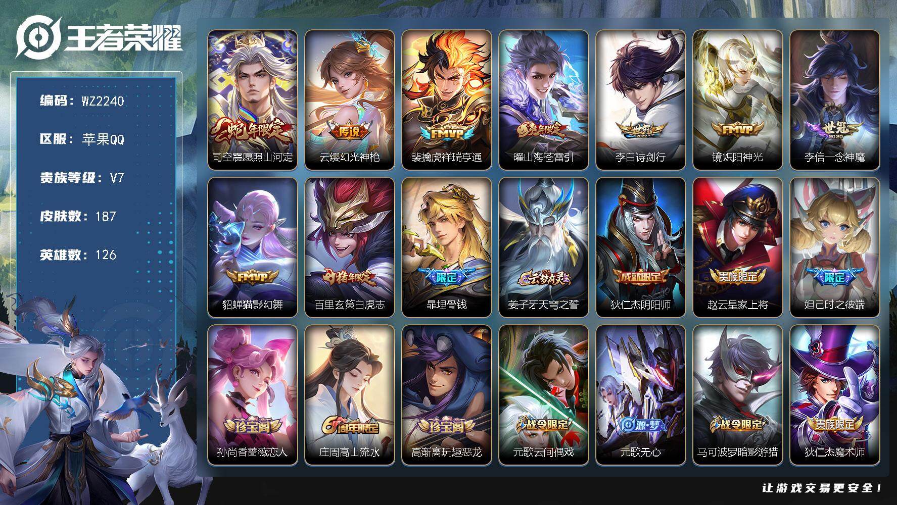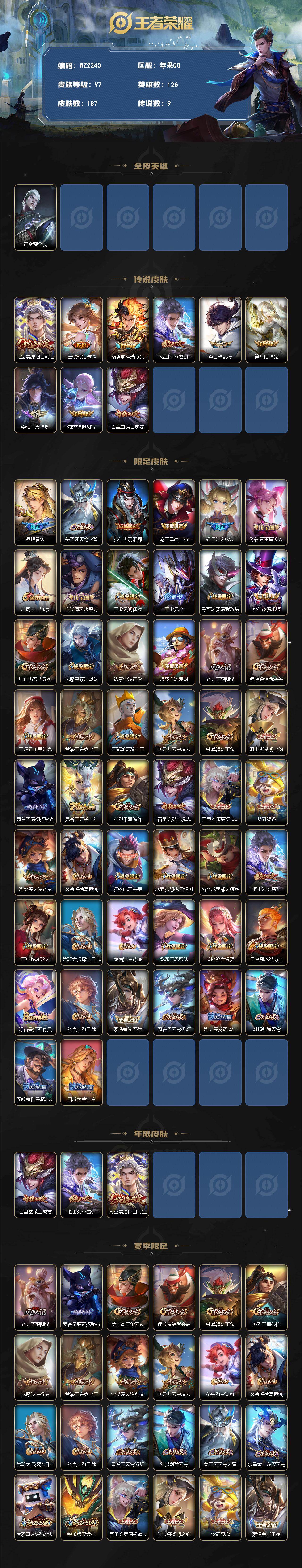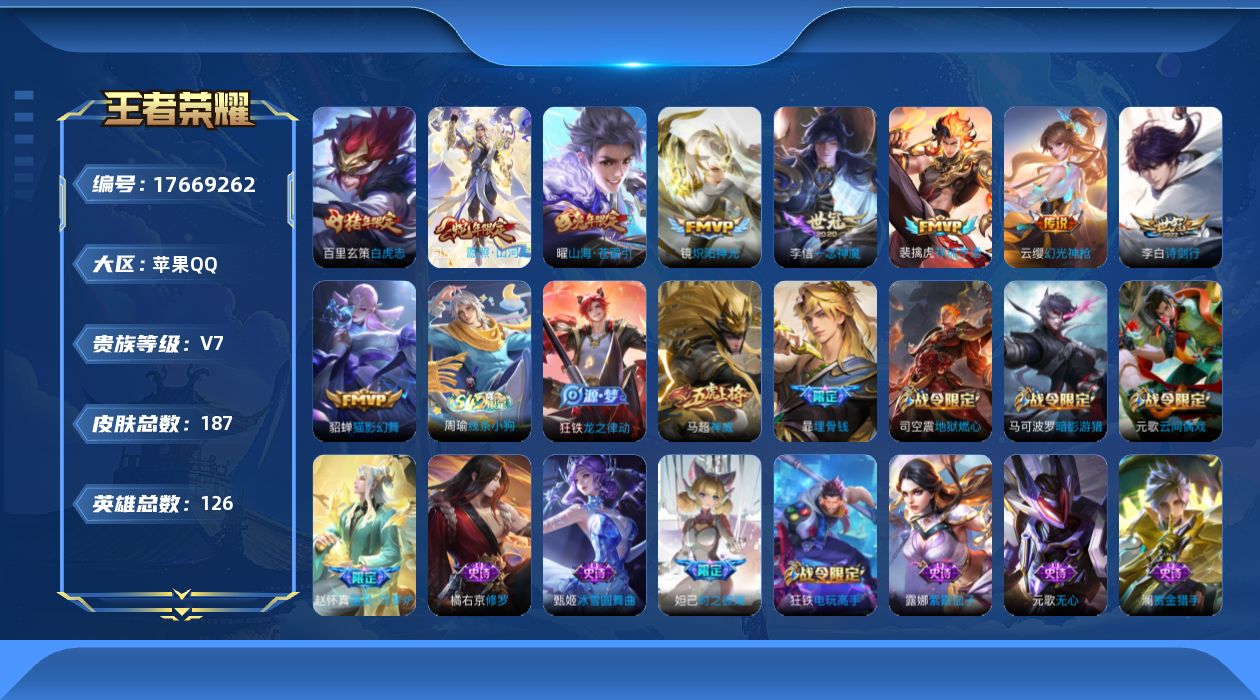 - [11631509]V8 1典藏 12传说 124英雄 302皮肤 可修改实名 优质装备:星域神启(倪克斯贼亮),黄金狮子座,炽阳神光,淬星耀世,碎云,山海·炽霜斩(李信年限),浮生妄,鹤羽星尊 传说皮:幻光神枪 珍宝阁皮:万物之道,女武神,玩趣恶龙 限定皮:愿照·九州拓(澜年限),鸣野蒿,至尊宝,神威(电光马子),飞衡(韩信年限),遇见飞天,高山流水,怒海麟威,五谷丰年,青龙志(铠年限),天狼运算者,游园惊梦,梁祝,李小龙,大圣娶亲,引擎之心,冰霜恋舞曲,唐三藏,神器·万象笔 史诗皮:灵蛊蚀心,星界战将,龙之律动,石田雨龙,炽弈燎原,蒙犽顽岩魄,电玩小子(小书包),黄金分割率,特工魅影,江河有灵,蒙恬荣光圣徽,冰冠公主,偶像歌手,白蛇,晚萤,电玩·爆裂旋风,暗夜猫娘,百相守梦(关羽),龙骑士(小龙虾),猫狗日记-孙策,猫狗日记-大乔,时之恋人-孙尚香,乱世虎臣,节奏热浪,女仆咖啡,摇滚巨星,水果甜心,天才门将,星夜王子,功夫厨神,德古拉伯爵,暗隐猎兽者,幽灵船长,鬼剑武藏,心灵战警,舞动绿茵,地狱岩魂,纤云弄巧,乘风破浪,逐浪之夏,水晶猎龙者,曙光守护者,唤灵魅影,金属风暴,原初追逐者,圣诞狂欢,圣诞恋歌,鹰眼统帅,暗夜贵公子,魅力维加斯,黎明之约,滕王阁序,无心,未来纪元-赵云