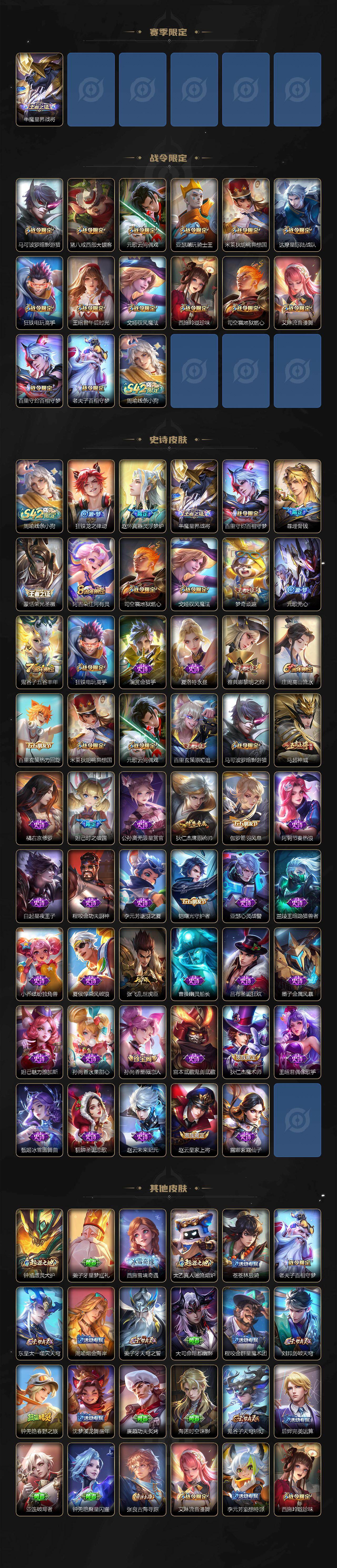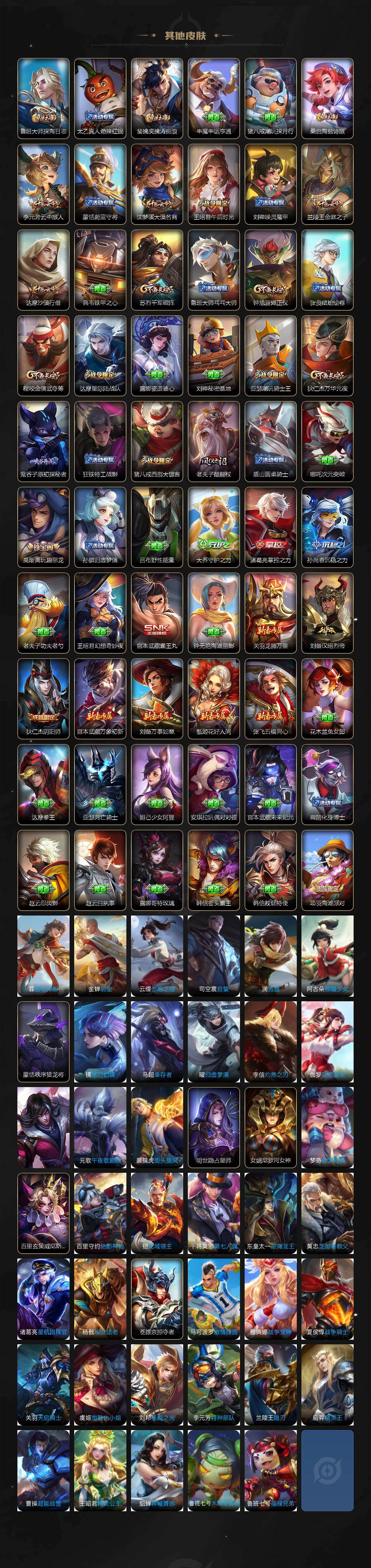 【限定皮肤】:暃埋骨钱,姜子牙天穹之誓,狄仁杰阴阳师,赵云皇家上将,妲己时之彼端,孙尚香蔷薇恋人,庄周高山流水,高渐离玩趣恶龙,元歌云间偶戏,元歌无心,马可波罗暗影游猎,狄仁杰魔术师,狄仁杰万华元夜,达摩星际陆战队,达摩沙漠行僧,项羽海滩派对,老夫子醍醐杖,程咬金演武夺筹,王昭君午后时光,兰陵王金庭之子,亚瑟潮玩骑士王,李元芳云中旅人,钟馗驱傩正仪,雅典娜黎明之约,鬼谷子原初探秘者,鬼谷子五谷丰年,苏烈千军破阵,百里玄策白虎志,百里玄策原初追逐者,梦奇顽趣,沈梦溪大漠名商,裴擒虎擒涛扼浪,狂铁电玩高手,米莱狄胡桃异想国,猪八戒西部大镖客,曜山海苍雷引,西施玲珑珍味,鲁班大师探海日志,桑启海盐诗旅,戈娅驭风魔法,艾琳流音漫舞,司空震地狱燃心,阿古朵江河有灵,张良古海寻踪,蒙恬荣光圣徽,鬼谷子天穹祈灯,沈梦溪龙舞盛年,刘邦剑破天穹,程咬金群星魔术团,周瑜熔金海岸