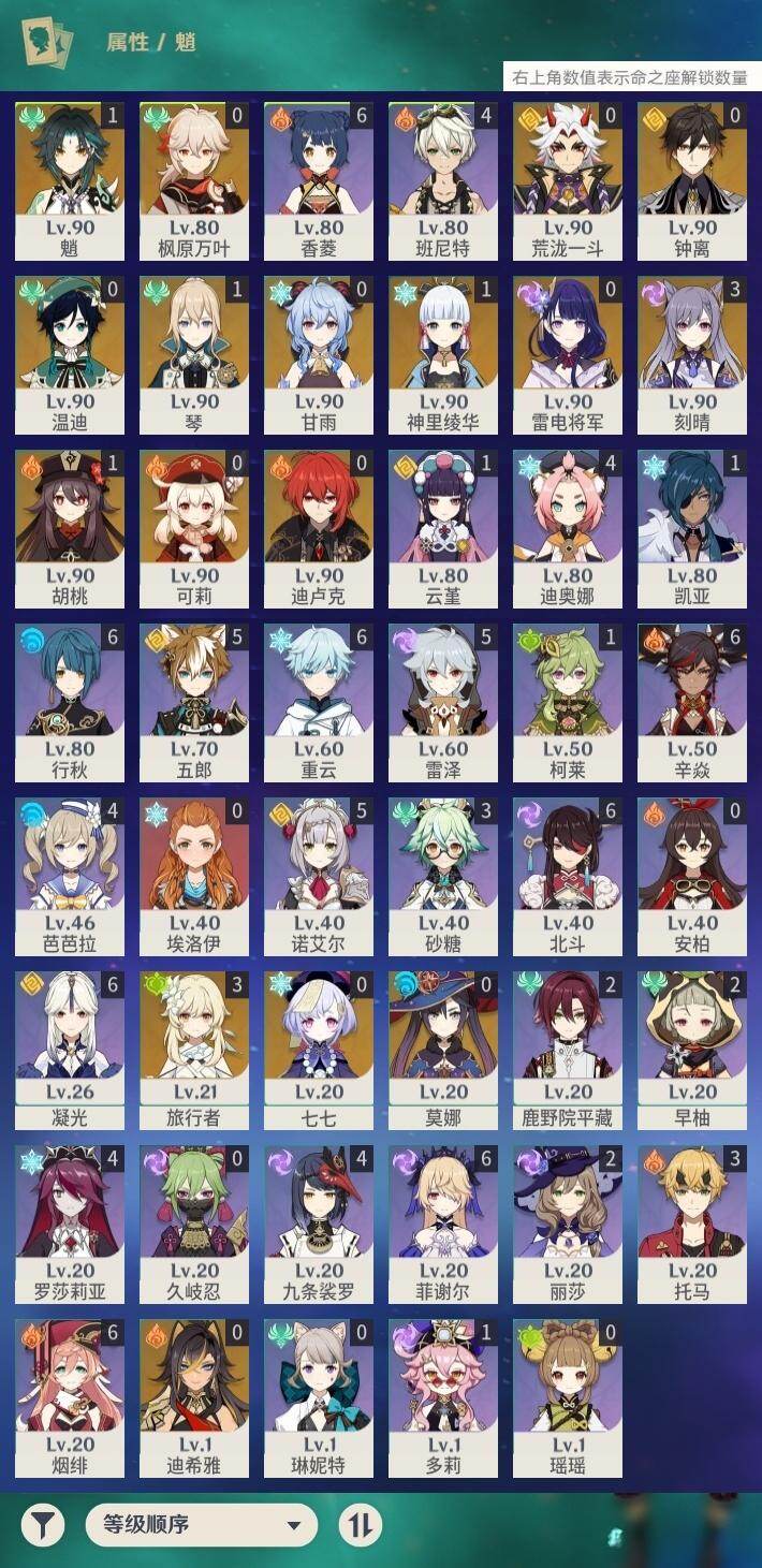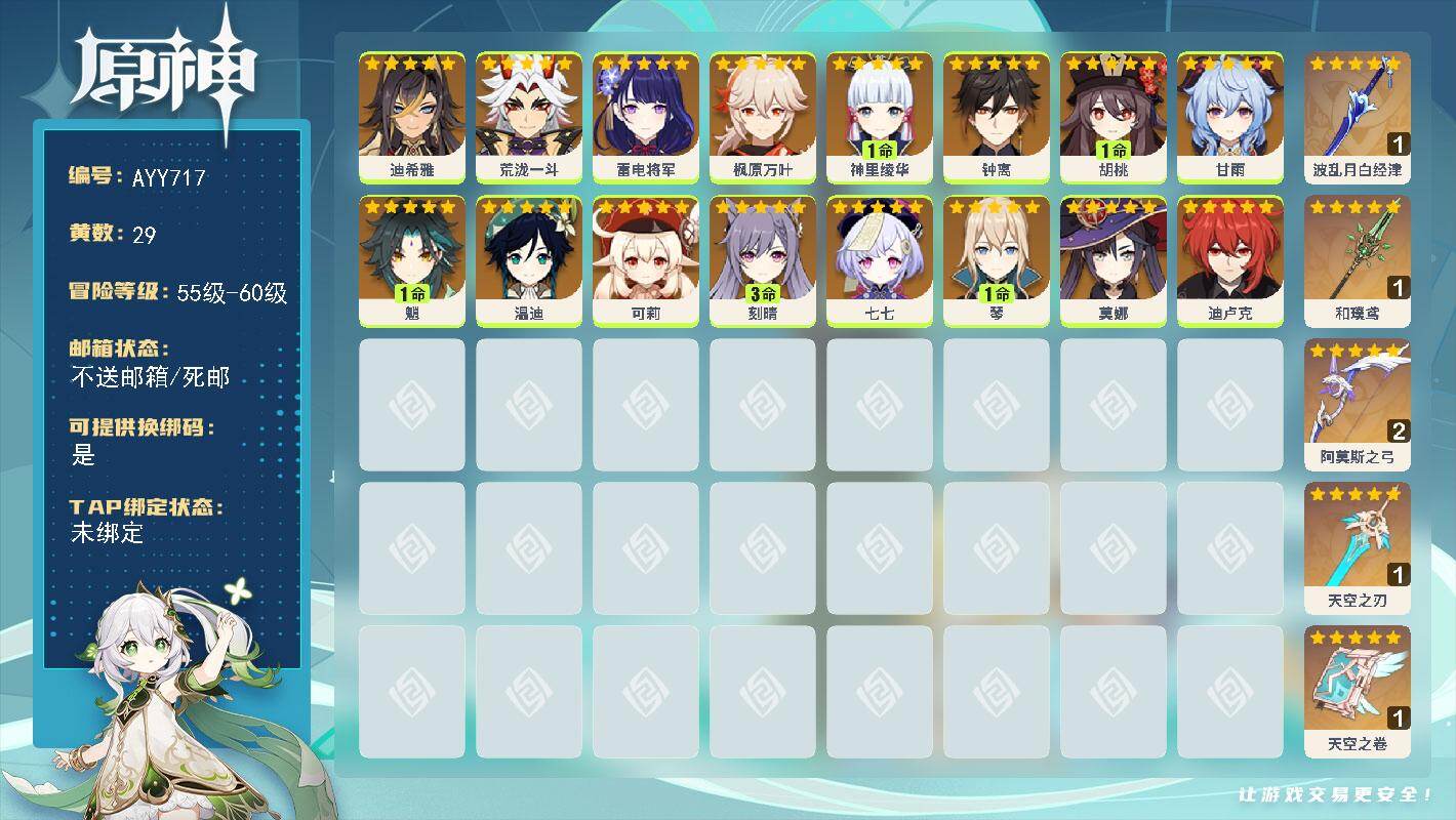 [17669456]58级/29黄/女主/16个五星角色/5个五星武器 0命迪希雅,0命荒泷一斗,0命雷电将军,0命枫原万叶,1命神里绫华,0命钟离,1命胡桃,0命甘雨,1命魈,0命温迪,0命可莉,3命刻晴,0命七七,1命琴,0命莫娜,0命迪卢克,精1波乱月白经津,精1和璞鸢,精2阿莫斯之弓,精1天空之刃,精1天空之卷
